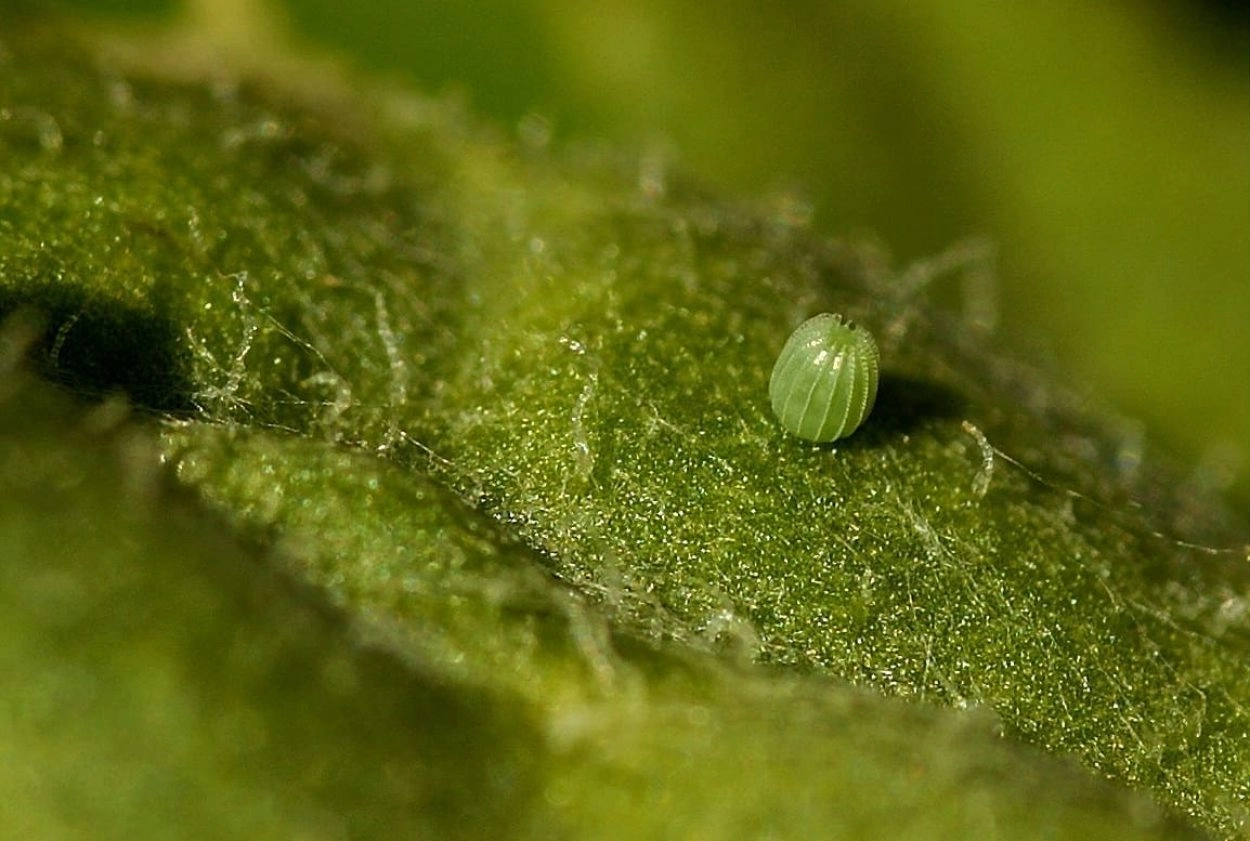 Het vrouwtje zet de eitjes afzonderlijk af, meestal op de bovenzijde van bladeren van planten die in een lage vegetatie en in de volle zon groeien. Om een geschikte plant te vinden, gebruikt zij de zintuigen op het voorste, onbehaarde gedeelte van het eerste potenpaar, de poetspoten.