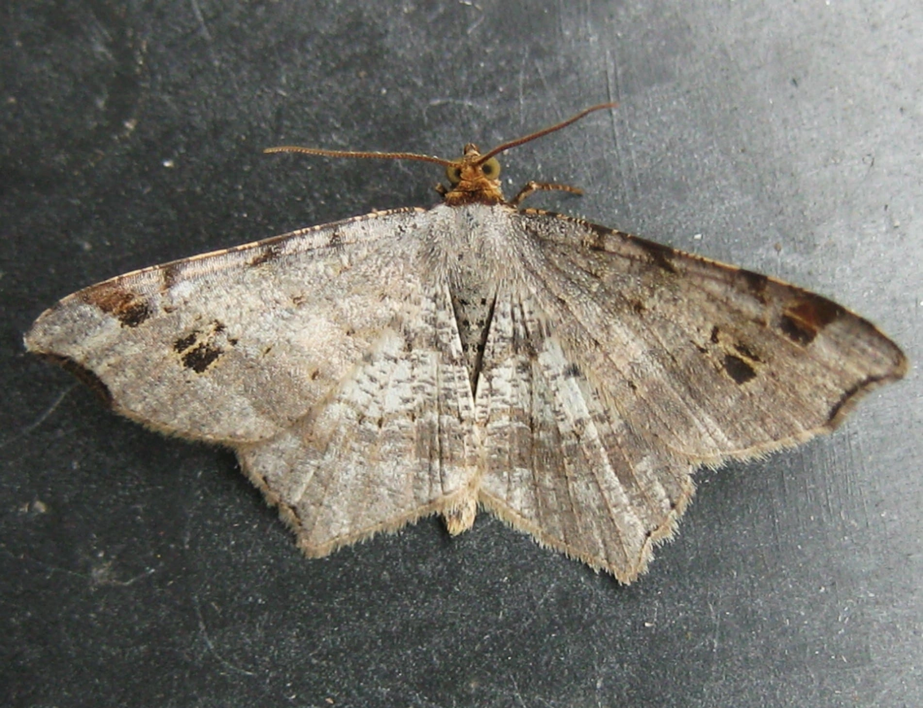 Voorvleugellengte: 13-15 mm. Op de voorvleugel is meestal duidelijk een brede grijze dwarsband te onderscheiden. Deze loopt door de zwarte vlek in de vorm van een ‘pootafdruk’ heen en zet zich voort over de achtervleugel (hoewel dit bij grijzere exemplaren niet meer opvalt). De uitholling aan de achterrand van de voorvleugel is net als de franje zeer donker, bijna zwart gekleurd. De bruine vlek aan de voorrand is vaak smal en loopt taps toe. Langs de rand van de achtervleugel loopt meestal een regelmatig gebroken of uit stippen bestaande lijn.