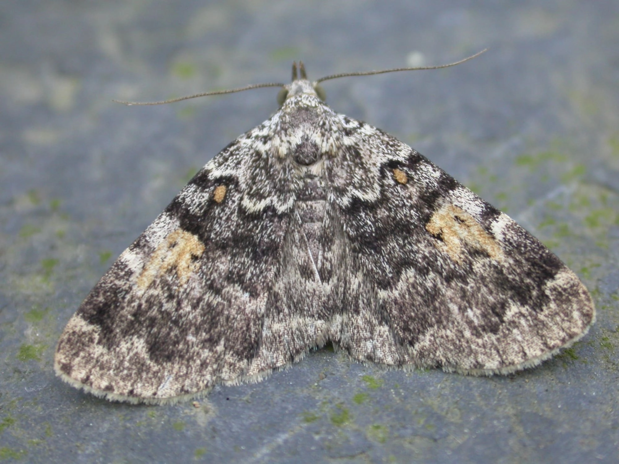 Voorvleugellengte: 11-14 mm. Een snuituil die qua tekening niet op de andere snuituilen lijkt (maar eerder doet denken aan bijvoorbeeld een schimmelspanner (Dysstroma-soorten)). Heeft een bont donker granietachtig uiterlijk van zwart of donkerbruinop een witachtige grondkleur. Het meest opvallende kenmerk is de grote lichtgele tot kaneelbruine middenvlek in de vorm van een ‘kies’, die zelf doorgaans ook weer twee zwarte vlekjes bevat.Meer naar binnen toe in het middenveld ligt nog een veel kleinere, eveneens gele of kaneelbruine vlek. De rest van de tekening bestaat uit twee witachtige grillige centrale dwarslijnen, met daartussen een onopvallende donkere middenschaduw, en een eveneens grillige witte golflijn. Al deze lijnen zijn zwart afgezet.
