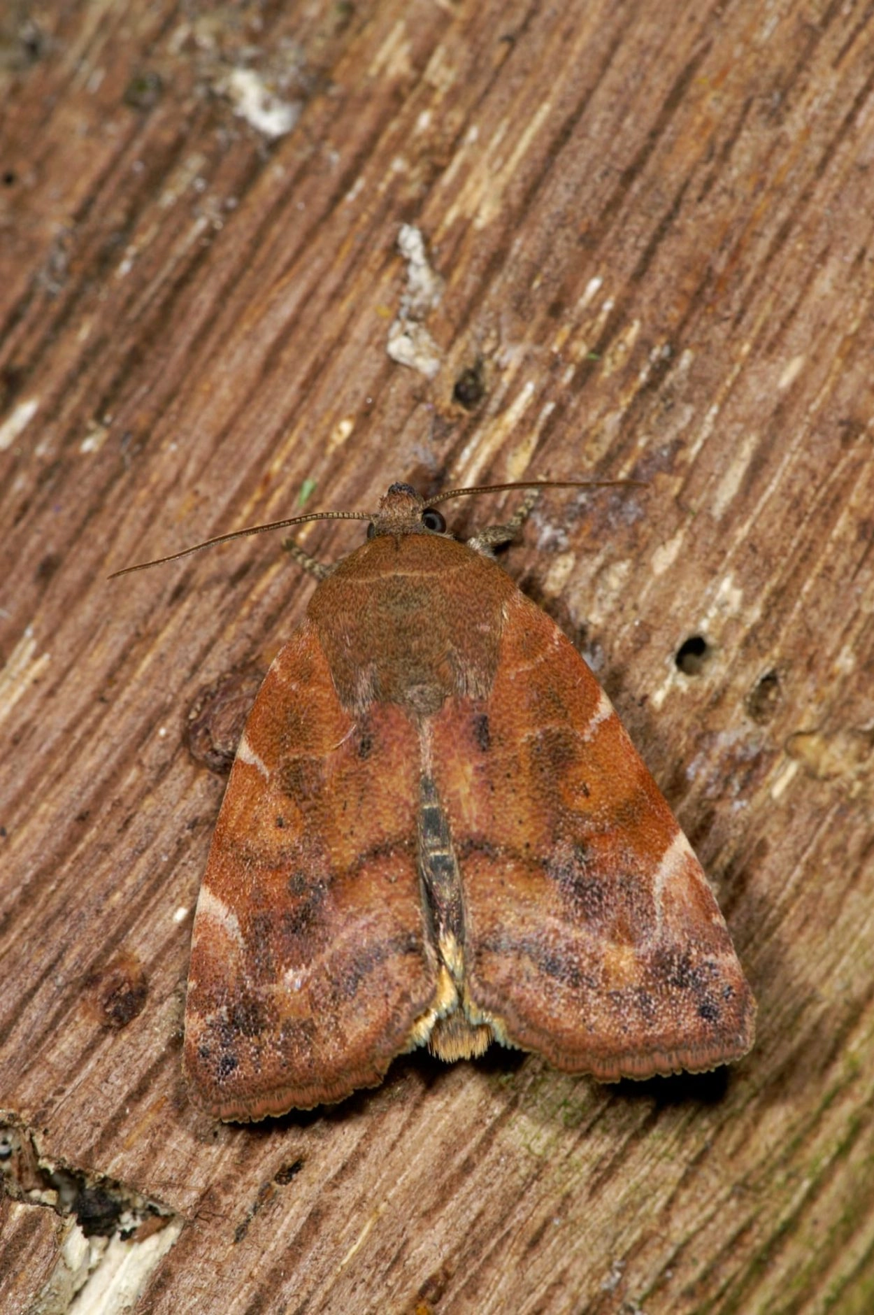 Voorvleugellengte: 12-16 mm. Deze uil houdt in rust de vleugels dicht tegen het lichaam gedrukt. De binnenrand van de roodachtig bruine voorvleugel is naar binnen gebogen. De wit afgezette dwarslijnen vertonen vlak voor de voorrand een scherpe knik; de witte afzetting verbreedt zich hier tot een dikke witte lijn of een kleine driehoekige vlek. Ook aan het uiteinde van de vaag zichtbare golflijn bevindt zich een witachtige vlek. Deze vormt in combinatie met de witte vlek aan het uiteinde van de buitenste dwarslijn een zwakke halvemaanvormige vlek. De ringvlek en de niervlek zijn slechts vaag zichtbaar; de ringvlek is gereduceerd tot een zwart puntje dat lichtbruin omrand is. De achtervleugel is donker, soms bijna zwart van kleur met een vrij brede crèmekleurige achterrand en een iets smallere crèmekleurige voorrand.