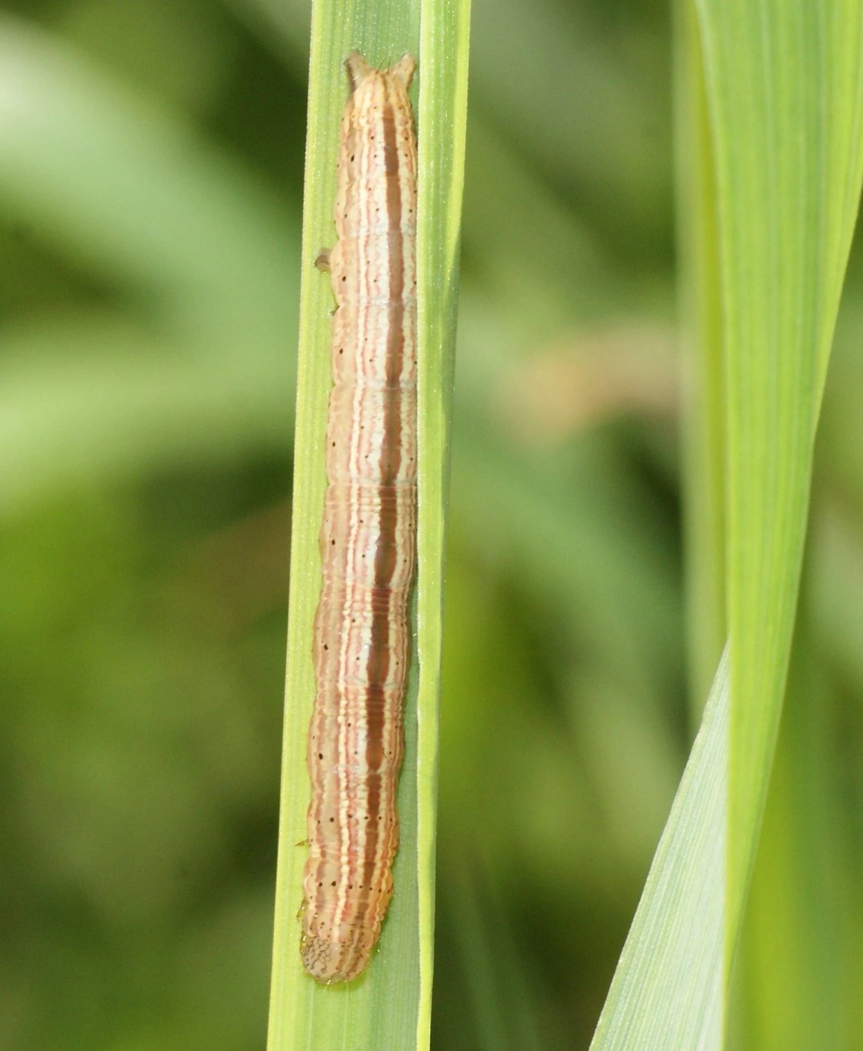 Tot 20 mm; slank en naar de staart iets versmald; lichaam geel of roodachtig bruin met over de rug een donkere middenstreep en aan weerszijden daarvan een lichte lengtestreep; langs de zwarte spiracula een roodachtige lengtestreep; ronde, bruine kop.
