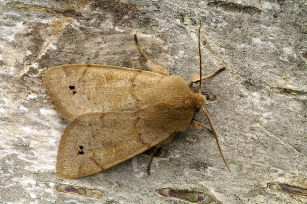 Voorvleugellengte: 17-20 mm. De vrij brede voorvleugel heeft een gebogen voorrand en loopt enigszins spits toe. Aan de binnenzijde van de vage lichte golflijn bevinden zich enkele dwars op de golflijn staande, zwart gekleurde vlekjes, waarvan de twee middelste sterk in het oog springen en meestal een opvallende dubbele vlek vormen; soms zijn ze bruin en minder duidelijk, heel zelden ontbreken ze. Van de rest van de tekening valt vooral de donkere binnenste lob van de niervlek op. De centrale dwarslijnen zijn slechts vaag zichtbaar. De voorvleugel heeft over het algemeen een geelachtig bruine grondkleur, maar kan ook meer rood- of grijsachtig bruin zijn; soms heeft de vleugel een enigszins korrelig uiterlijk. De antennen van het mannetje zijn zichtbaar geveerd; die van het vrouwtje hebben uitsteeksels die alleen met een loep zichtbaar zijn.