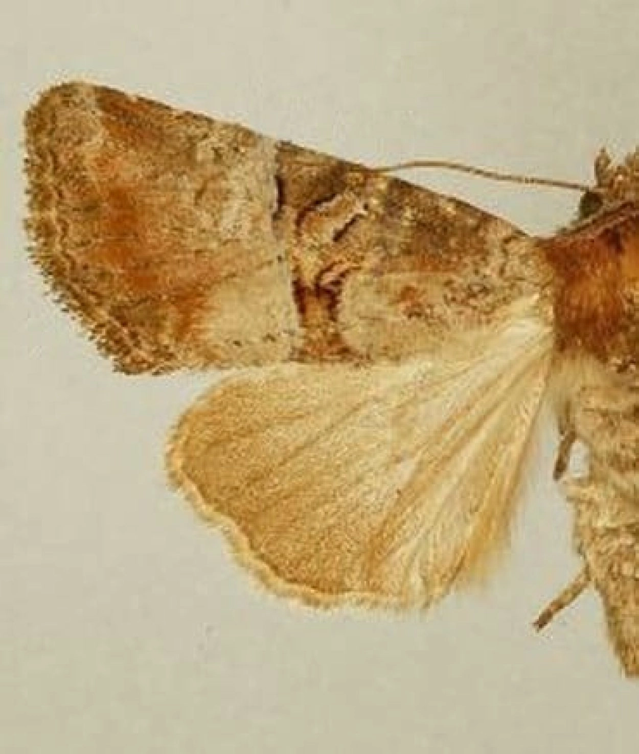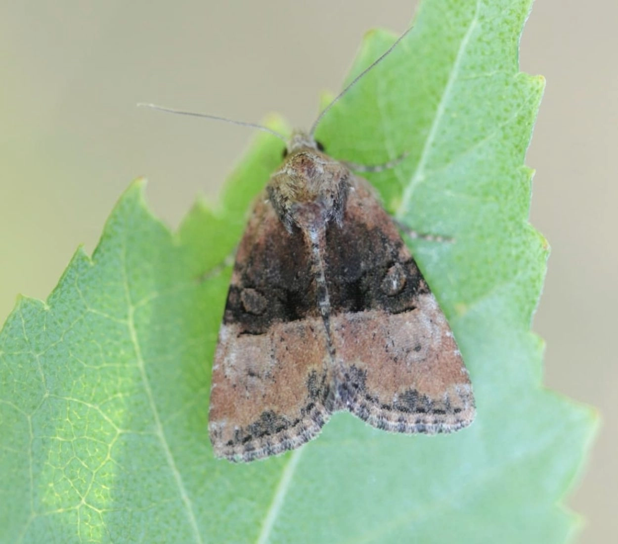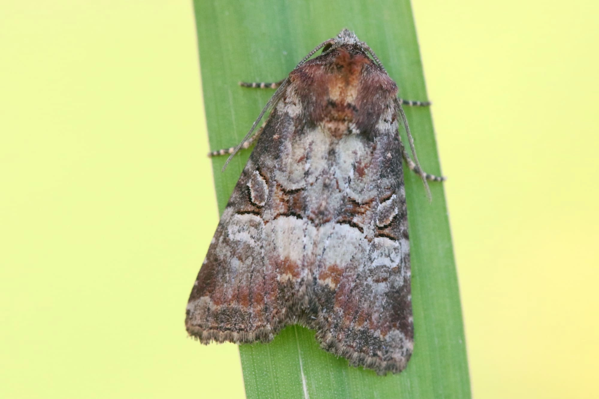 Voorvleugellengte: 10-13 mm. Een variabele soort met in de meeste gevallen een karakteristieke combinatie van roze- of roodachtig bruine en lichtgrijze kleuren op een bruingrijze of soms geelbruine ondergrond. De roze- of roodachtige kleur is opvallend aanwezig in het zoomveld en op de bovenzijde van het borststuk. De lichtgrijze kleur is vooral aanwezig in het wortelveld en aan de buitenzijde van de opvallende, zwart gerande scheidingslijn halverwege de voorvleugel, een in het oog springend kenmerk zoals dat ook voorkomt bij het zandhalmuiltje (Mesoligia furuncula). Op korte afstand van deze zwart gerande scheidingslijn loopt een sterk gebogen binnenste dwarslijn die eveneens opvallend zwart gerand is. De zone tussen deze beide lijnen is vaak donkerder gekleurd dan de rest van de vleugel en vormt zo een smalle ‘middenband’ die zich wigvormig verbreedt naar de voorrand toe. In deze band liggen een duidelijke ringvlek en een korte zwartachtige verbindingsbalk tussen de beide lijnen. Het zoomveld is niet verdonkerd. Sommige vlinders zijn contrastrijk getekend, andere hebben een meer effen uiterlijk. Bij contrastrijk getekende vlinders is de soms witachtig grijze niervlek goed te onderscheiden, vooral door de gedeeltelijk zwarte omranding. In meer effen gekleurde vlinders valt de niervlek echter grotendeels weg tegen de grijze achtergrond. Soms komen exemplaren voor die als geheel donker gekleurd zijn.