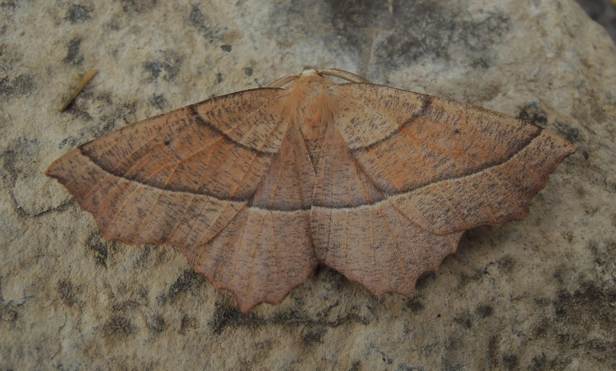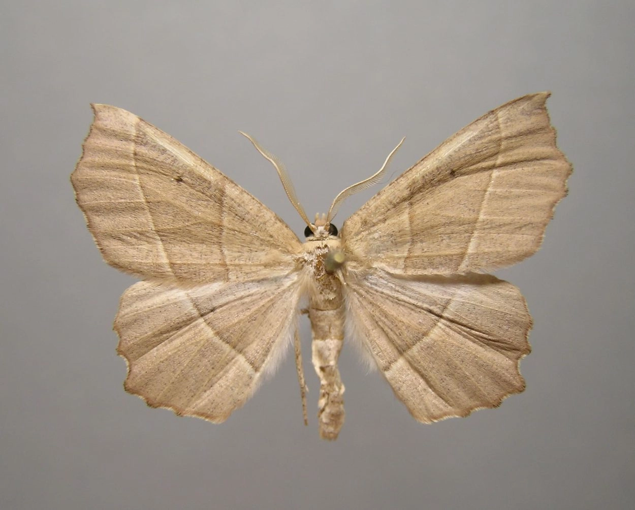 Voorvleugellengte: ♂ 20-23 mm, ♀ 35-38 mm. De voorvleugel van het vrouwtje is geelachtig bruingrijs, die van het mannetje meer roodachtig grijs. Over de voorvleugel lopen tamelijk rechte donkere dwarslijnen die aan een kant zijn afgezet met een witte lijn. In de spitse vleugelpunt bevindt zich een donker lijntje. De geschulpte achterrand van zowel de voor- als de achtervleugel heeft een stompe hoek en op alle vier de vleugels bevindt zich een kleine donkere middenstip.