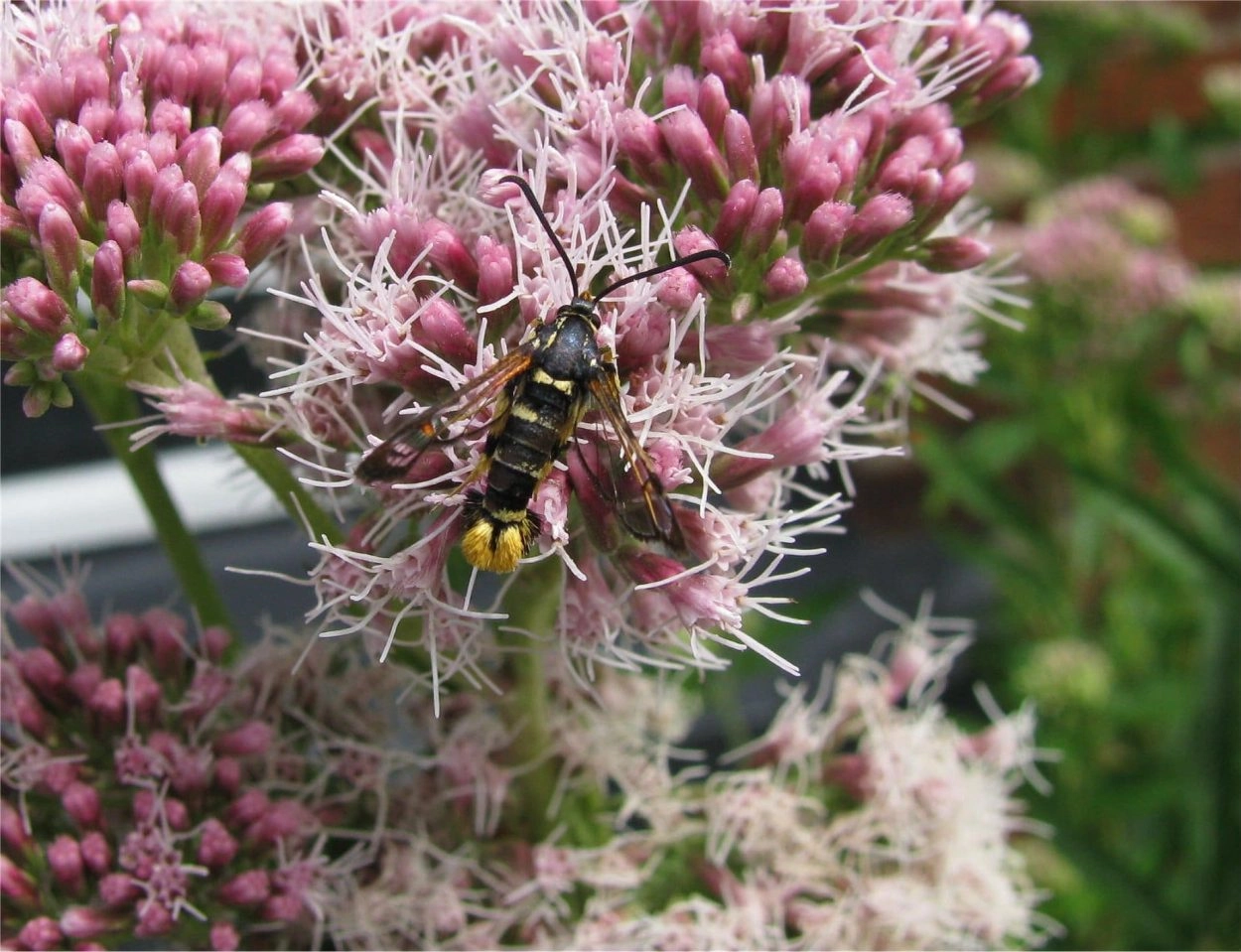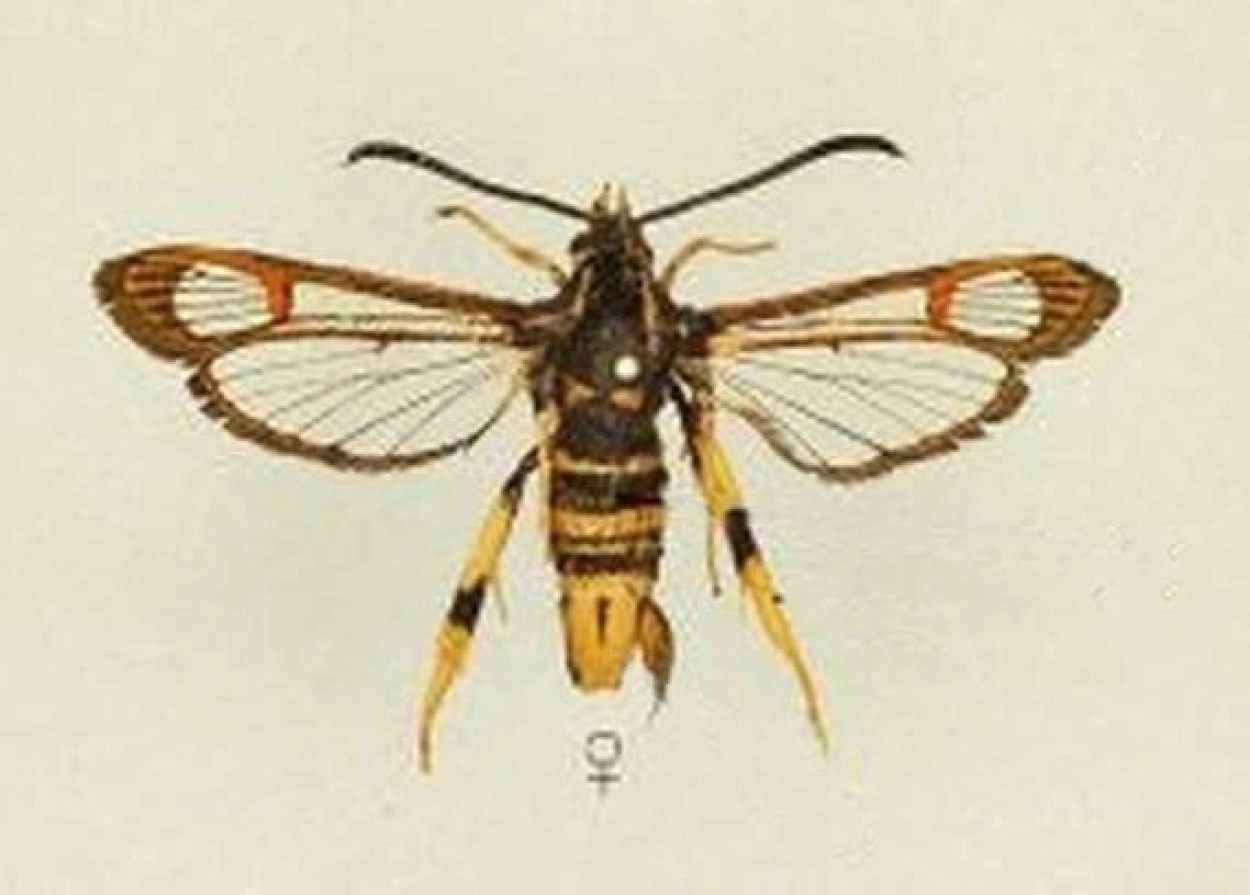 Voorvleugellengte: 10-12 mm. De middenband op de voorvleugel is roodachtig en de goed zichtbare delen van de poten zijn overwegend geel; hierdoor is deze soort gemakkelijk te onderscheiden van vrijwel alle andere wespvlinders. Op het achterlijf bevinden zich vier, in uitzonderlijke gevallen drie of vijf, gele banden. Over het borststuk lopen twee dunne gele lijnen, die echter alleen goed te zien zijn bij verse vlinders; achter aan het borststuk bevindt zich een gele band. Het staartpluimpje is bij het vrouwtje aan de bovenkant geel (ook in de vlucht duidelijk zichtbaar) en bij het mannetje zwart met wat geel aan de onderkant.