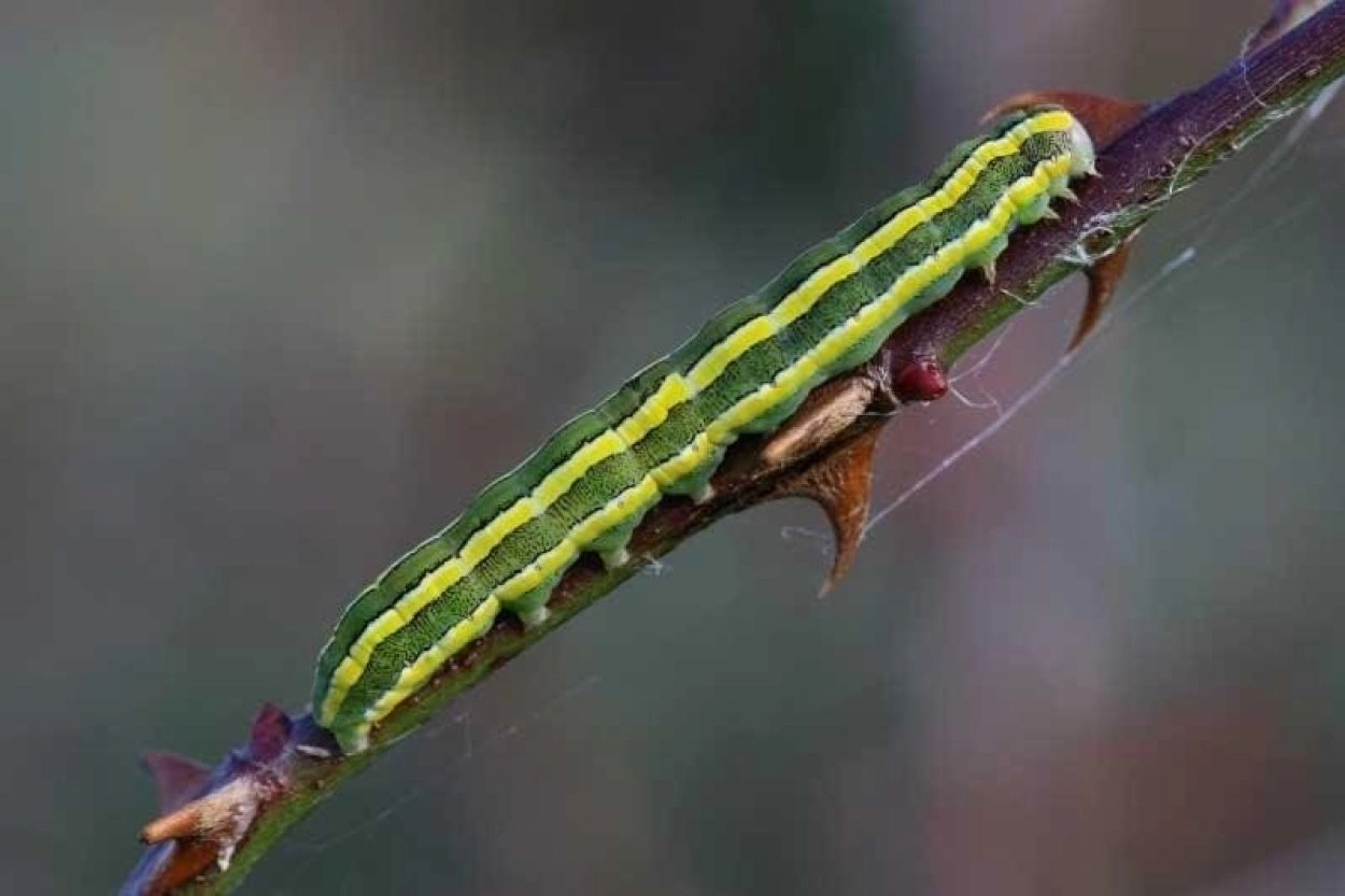 Tot 45 mm; lichaam varieert in kleur van groen tot roodachtig bruin of donker purperachtig bruin met twee brede, gele lengtebanden over de rug en een brede, gele lengteband over de spiracula; kop bruin of groenachtig bruin.