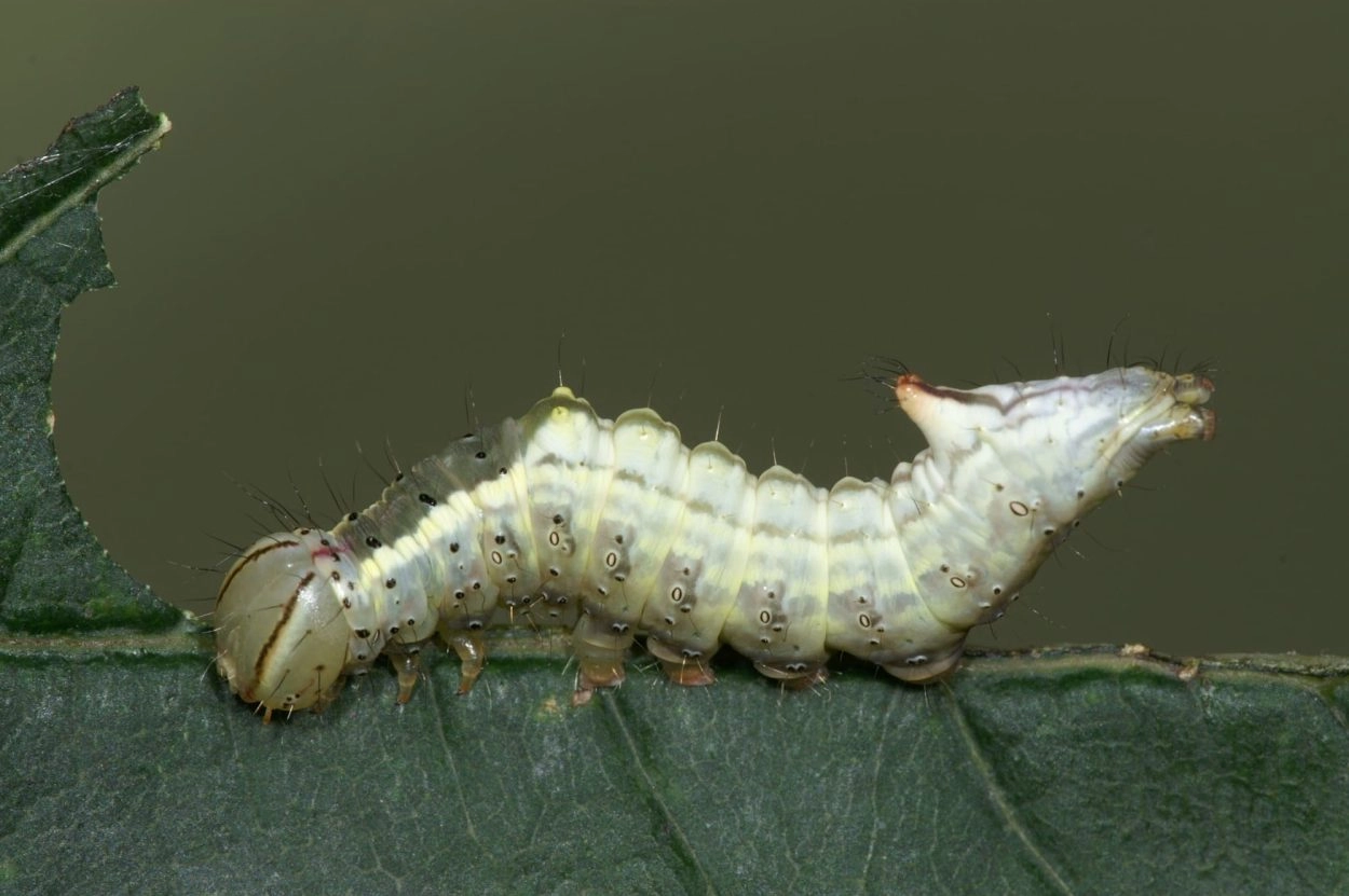 Tot 30 mm; vrij dik in het midden, versmald naar de uiteinden; lichaam groenachtig wit tot bleek groen met over de rug een donker purperachtig groene middenband, die naar de staart smal uitloopt; segment elf met een witachtige of grijsachtige gevorkte bult met helderroze punten; onderzijde met purperen zweem; kop bruinachtig wit met donkerbruine, V-vormige tekening.