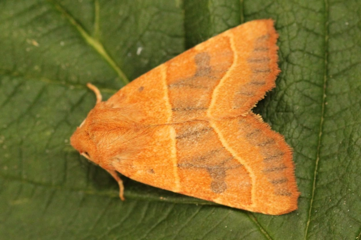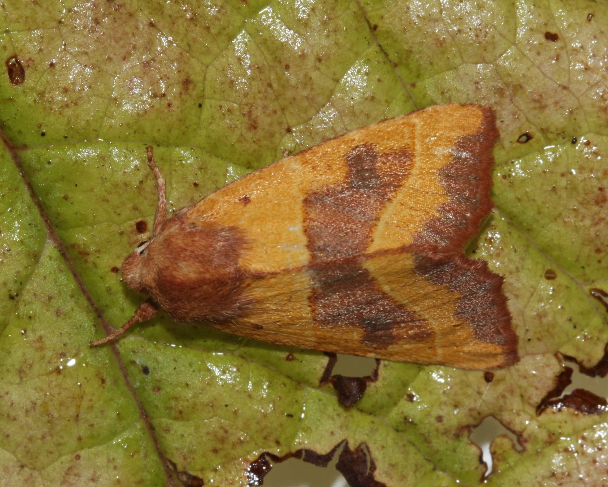 Voorvleugellengte: 15-18 mm. De enigszins geschulpte achterrand van de brede voorvleugel maakt een vrij rechte hoek met de voorrand en wijkt vanaf het midden sterk naar binnen. Over de oranjegele, soms rood- of purperachtige voorvleugel loopt een brede, geel met rozeachtig bruin gevlekte middenband die met gele of oranjebruine dwarsbanden is afgezet. In de middenband liggen soms grijsachtige vlekken. De niervlek maakt deel uit van de middenband en is soms vaag, de ringvlek is niet zichtbaar. De vleugelzoom is rozeachtig bruin. De tekening van deze uil is vrij constant, maar de intensiteit ervan kan aanzienlijk variëren. Soms komen exemplaren voor met een vrijwel ongetekende voorvleugel.