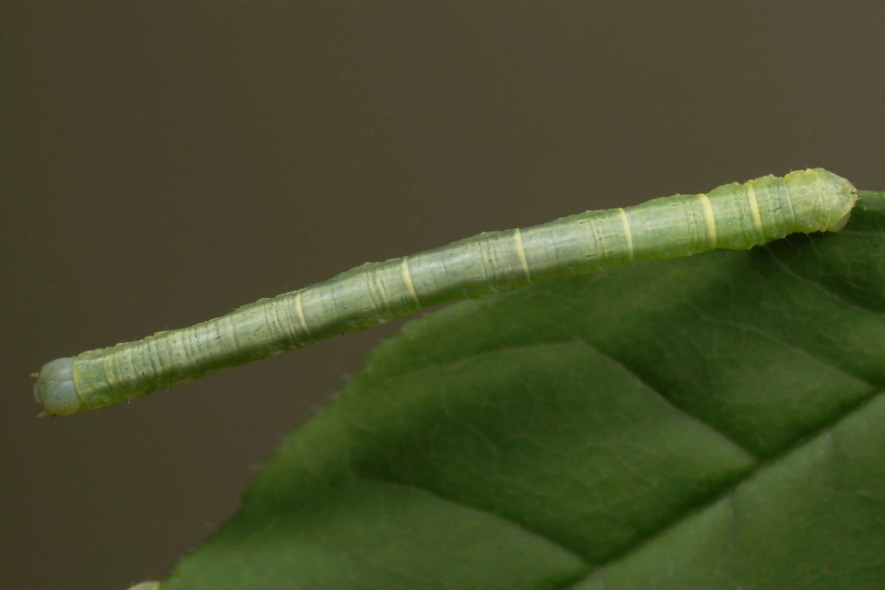 Tot 40 mm; slank, geelachtig groen met geelachtige ringen tussen de segmenten; soms met roodachtig bruine tekening op rug en flanken; op de rugzijde van de segmenten vijf, zes, acht en elf kleine uitwassen. Het groen van de jonge rupsjes is veel donkerder.