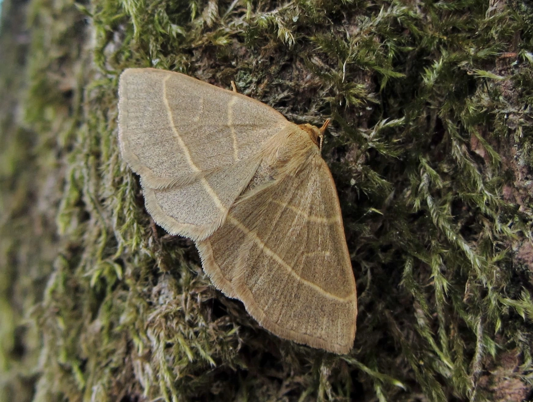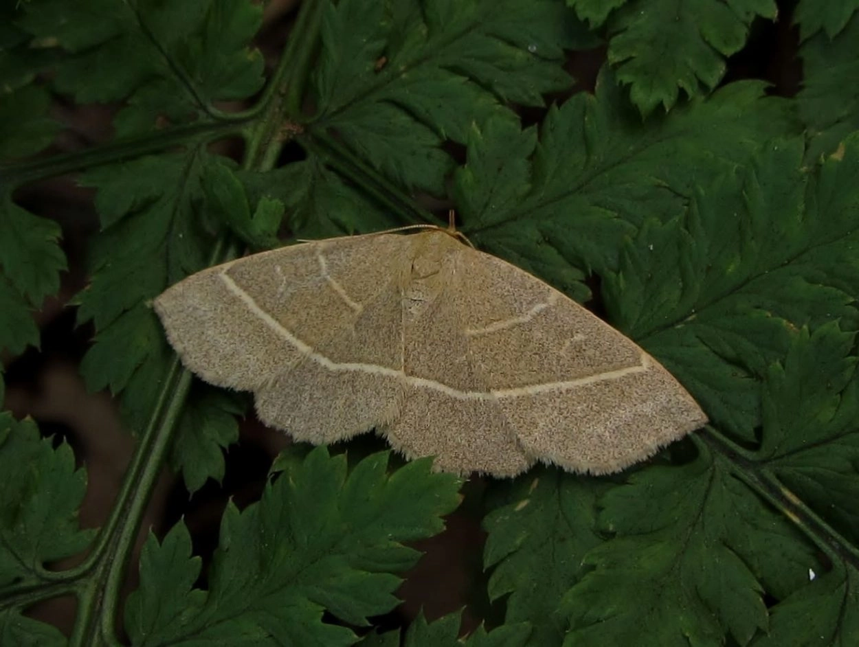 Voorvleugellengte: 14 mm. In tegenstelling tot de meeste verwante soorten rust deze snuituil met de vleugels uitgespreid als een spanner. De grondkleur van de voorvleugel varieert van licht reebruin tot zandbruin, vaak enigszins groenachtig getint. Opvallend zijn de twee geelachtige dwarslijnen waarvan de buitenste doorloopt over de achtervleugel; de dwarslijnen zijn altijd lichter dan de grondkleur van de vleugel. De middenvlek is zichtbaar als een smal geelachtig lijntje.