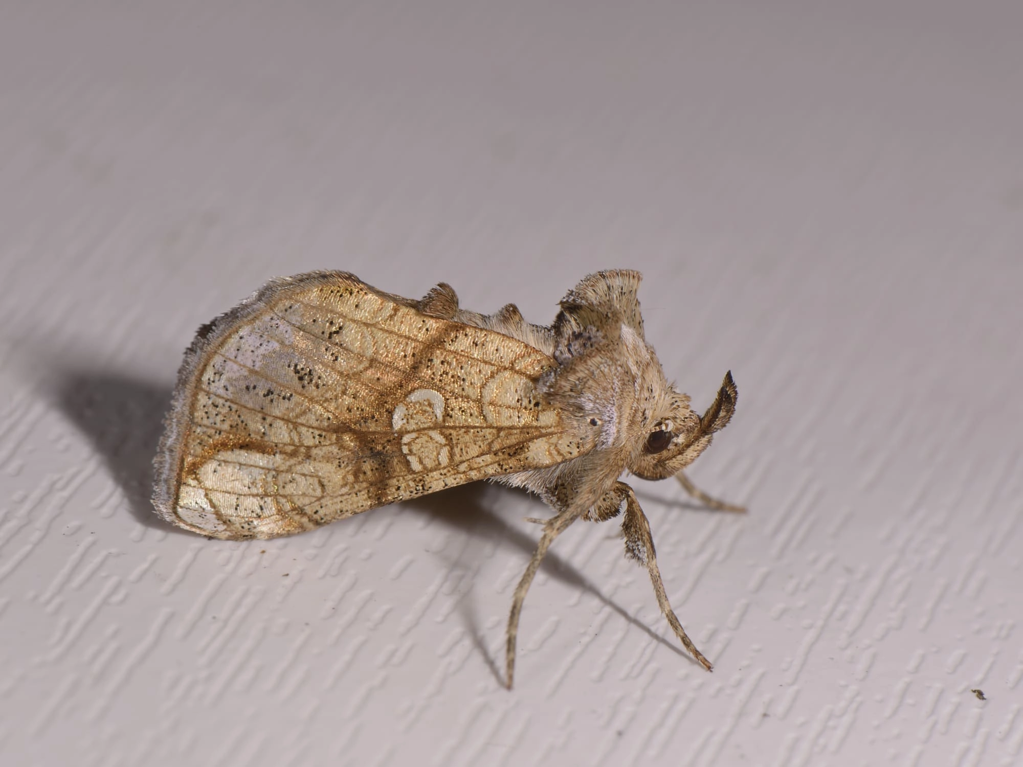 Voorvleugellengte: 17-20 mm. Deze uil heeft een grote waaiervormige kuif op de bovenzijde van het borststuk; verderop op het borststuk en het achterlijf zijn nog twee kuifjes zichtbaar. De kleur van de brede voorvleugel is een mengeling van bruin, grijs en goudgeel, met soms in het zoomveld een groenachtige tint. De verhouding tussen de verschillende kleuren varieert; sommige vlinders maken een lichte en vooral grijze indruk, andere zijn donkerder en overheersend bruin. De vleugelzoom is vaak iets lichter; opvallend is vooral de grote witachtige vlek in de vleugelpunt. Karakteristiek is de breed zilverachtig wit geringde vlek in het midden van de voorvleugel; deze vlek lijkt uit twee grote aaneengesloten ringvlekken te bestaan. Aan de buitenzijde hiervan bevindt zich een in het midden scherp gehoekte zwartachtige middelste dwarslijn. Soms komen exemplaren voor met een bruine voorvleugel met grote zwarte vlekken langs de achterrand.