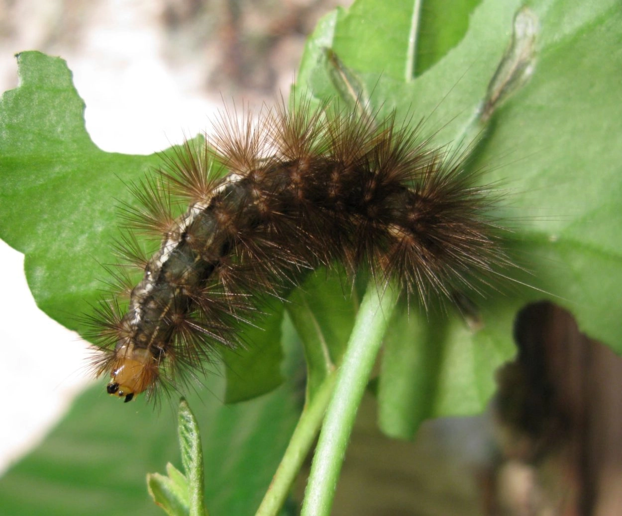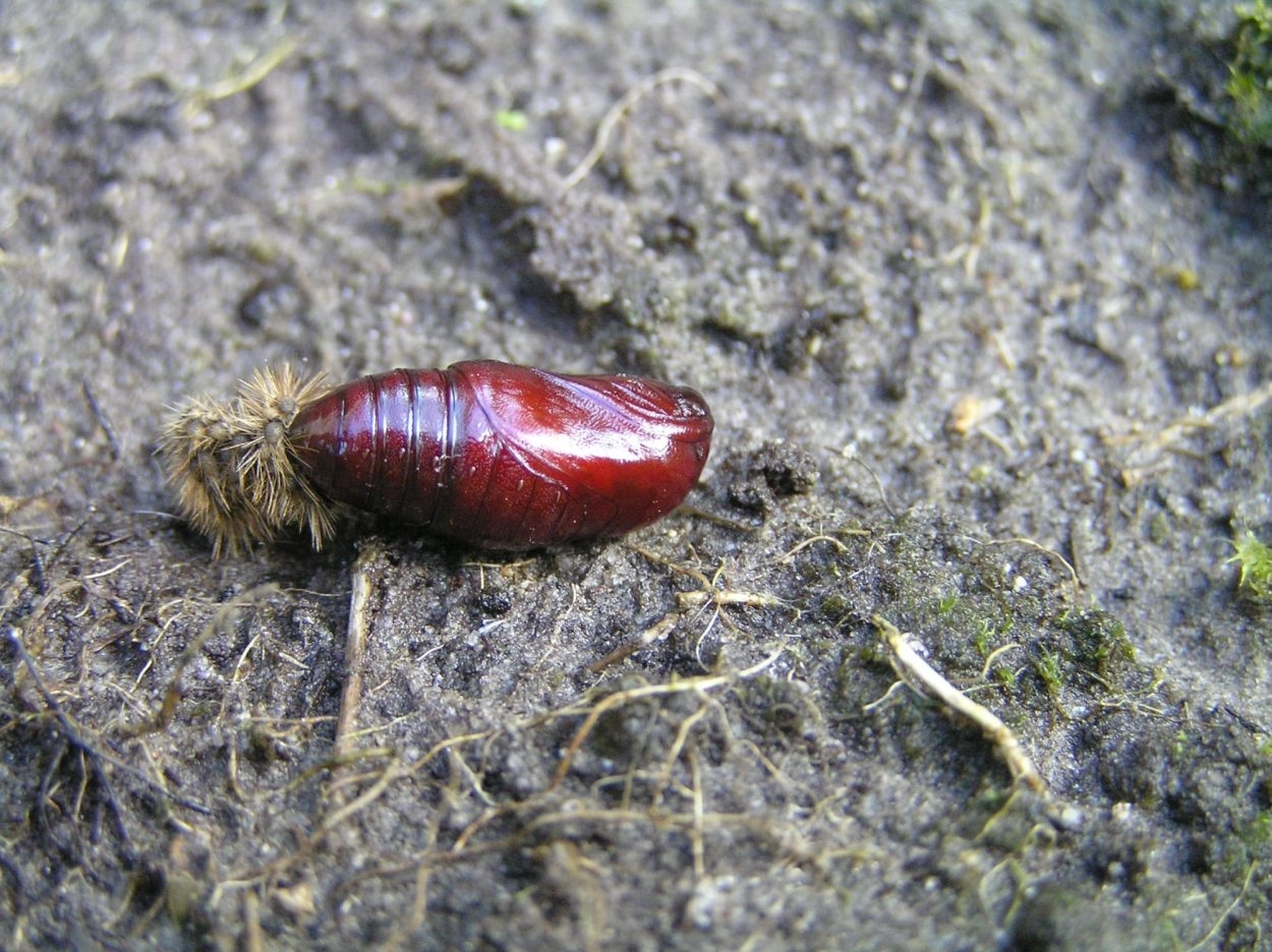 Tot 45 mm; lichaam grijsachtig bruin, donkerder op de rug, bekleed met bruine haarborstels op verheven, lichtbruine wratten; een onduidelijke bleke middenstreep over de rug en een brede, witachtige lengtestreep over de flanken; kop bleek geelachtig bruin.