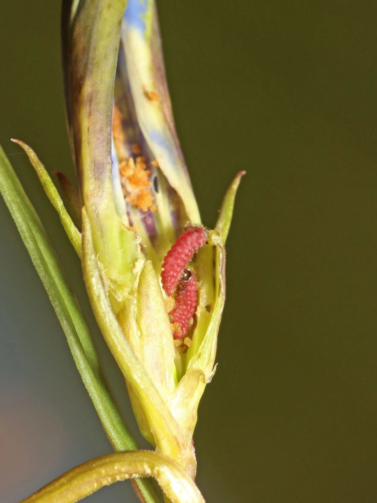 Rups: begin augustus-begin juli. De jonge rups eet zich vanuit het eitje direct de bloem in en eet vooral van het vruchtbeginsel; het lege eitje blijft duidelijk zichtbaar achter op de bloemknop. Na een dag of tien laat de rups zich op de grond vallen en wacht tot hij wordt meegenomen door een bossteekmier (Myrmica ruginodis) of een moerassteekmier (M.scabrinodis). De soort overwintert als rups in het mierennest en daar vindt ook de verpopping plaats.