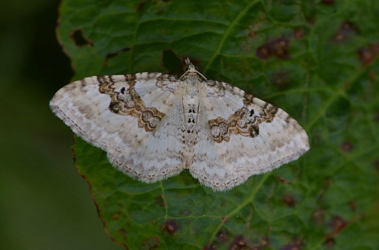 Voorvleugellengte: 14-17 mm. Deze nogal variabele bandspanner heeft kenmerkend witte tot crèmekleurige vleugels waarover een onregelmatig gevormde middenband loopt. De achtervleugel toont de middenband slechts vaag en is daardoor meer effen gekleurd. Op de voorvleugel is in de band, dicht bij de voorrand, meestal een wit veld aanwezig met daarin een doorgaans duidelijk zichtbare zwarte middenstip. De kleur en de breedte van de middenband variëren; doorgaans zijn er twee bruine randzones met donkere dwarslijnen en een grijsachtig blauwe middenzone. Soms is deze laatste zeer licht van kleur en komt deze min of meer overeen met de grondkleur zodat er sprake lijkt van twee los van elkaar liggende smalle bruine dwarsbanden. Soms echter is de middenband als geheel juist sterk donker gekleurd en kan deze in incidentele gevallen zelfs één brede zwartachtige band vormen. Een bijna altijd zichtbaar kenmerk is de zwartachtige punt aan de buitenzijde van de middenband.