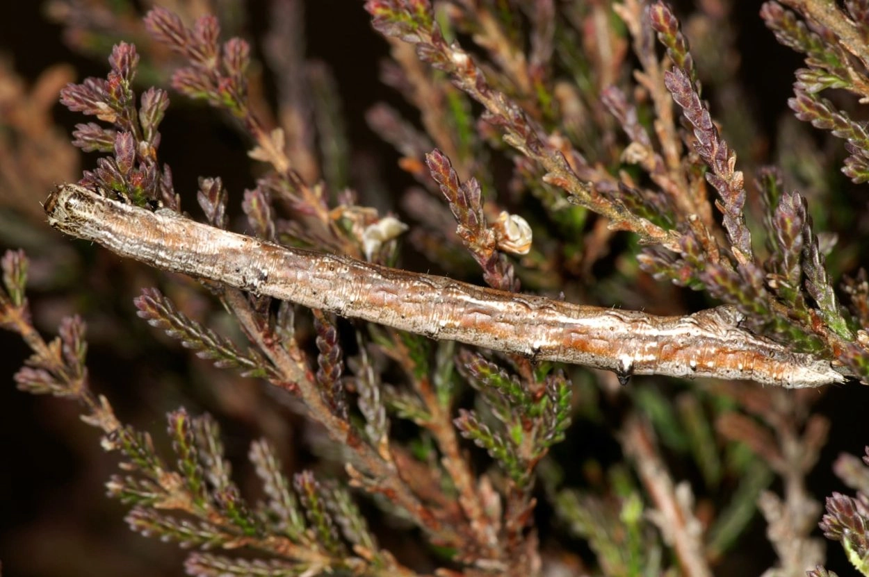 Tot 38 mm; lichaam varieert in kleur van donker purperachtig grijs tot okerkleurig of geelachtig bruin, met een paar donkere lengtestrepen over de rug en donkere lengtestrepen op de flanken; de segmenten vijf, zes en zeven hebben elk een paar wratten op de rugzijde; kop geelachtig of grijsachtig bruin.