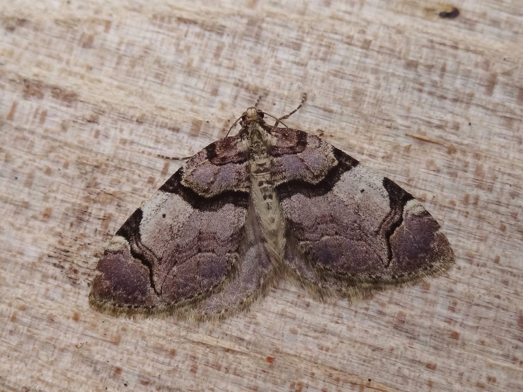 Voorvleugellengte: 14-16 mm. Een opvallend getekende, grijze of bruinachtig grijze spanner; verse exemplaren hebben vaak een violette tint. De tamelijk afgeronde voorvleugel heeft een brede lichte middenband die aan de binnenzijde afgezet is met een opvallend dikke zwarte lijn. De buitenrand van de middenband is vanaf de voorrand tot bijna halverwege de vleugel donker gekleurd, maakt daar een scherpe bocht in de richting van de achterrand, knikt weer terug in de richting van de binnenrand en vervaagt vervolgens. De tekening is weinig variabel, de kleur van de lichte middenband kan variëren van witachtig tot grijs of bruin.