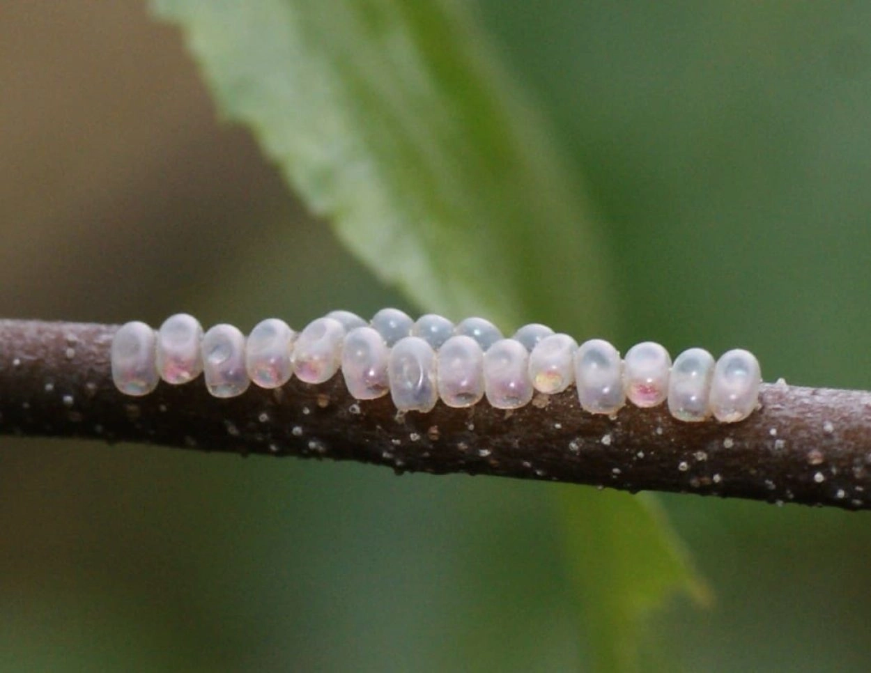 Tot 63 mm; zeer dik naar de kop sterk versmald lichaam, segment elf met een hoornvormige bult op de rugzijde; lichaam groen, op de rug witachtig en op de flanken dicht zwart gespikkeld; rug met een donkergroene middenstreep, die aan weerszijden door een rij schuine, witte strepen wordt begrensd; op de flanken van de eerste drie lichaamssegmenten een brede, geelachtig witte lengtestreep; kop groen met geelachtig witte strepen.
