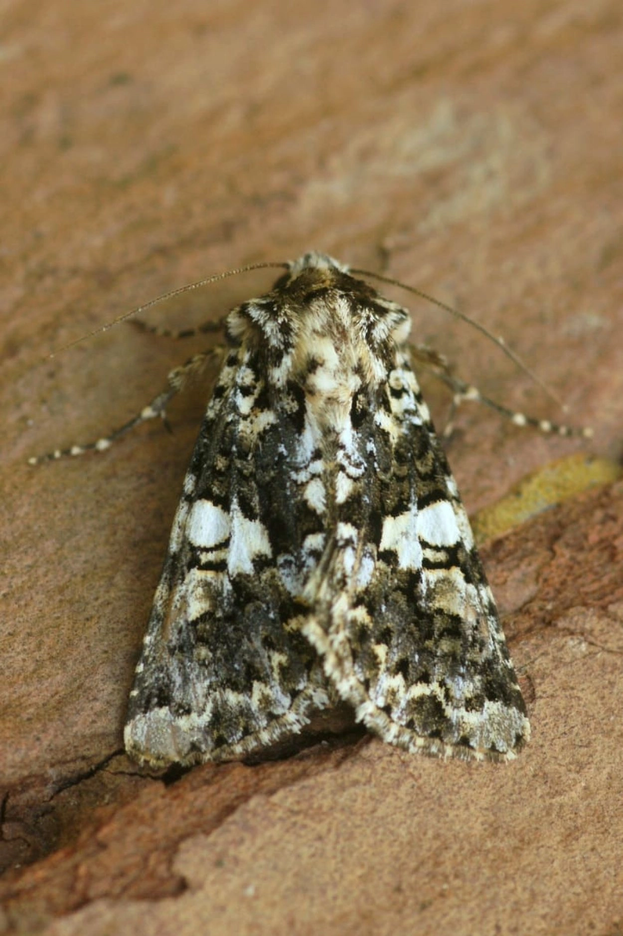 Voorvleugellengte: 14-16 mm. Op de zwartachtig grijze voorvleugel bevinden zich enkele kenmerkende witte vlekken: in de vleugelpunt, in de binnenrandhoek en rond de eveneens witte ringvlek en niervlek. De vlekken rond de niervlek en de ringvlek zijn soms samengesmolten tot een soort diagonale band, die echter nooit de binnenrand van de vleugel raakt.