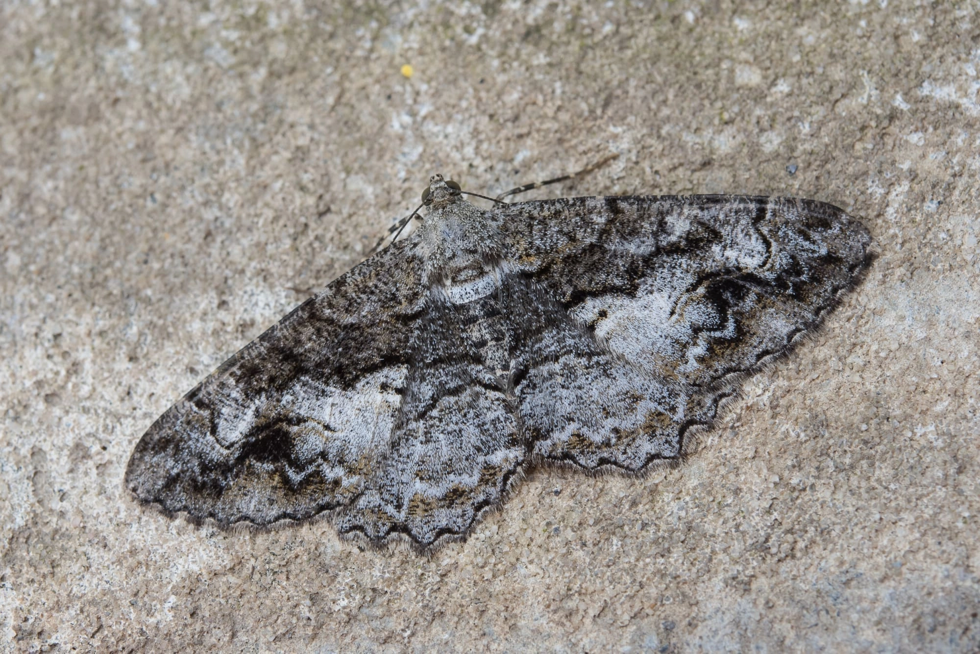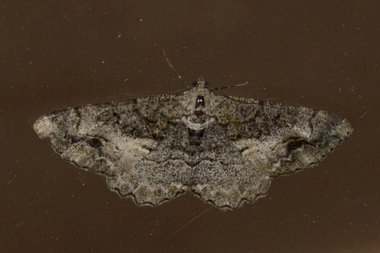 Voorvleugellengte: 22-25 mm. De vleugels van deze vlinder laten een wisselende mengeling van grijs en bruin zien met soms, met name in het zoomveld, een oranje tint. Over de voorvleugel loopt, evenals bij de variabele spikkelspanner (A. repandata), een kenmerkende slingerende buitenste dwarslijn. Aan de buitenzijde hiervan, tussen deze dwarslijn en de lichte golflijn, ligt een opvallende zwarte vlek. Opvallend bij het mannetje is de zwarte, doorgaans dikke, dicht tegen de binnenste dwarslijn aan gelegen middenschaduw. Bij het vrouwtje is sprake van een tamelijk vage, soms sterk getande middelste dwarslijn die meer halverwege de binnenste en de buitenste dwarslijn ligt. Het veld aan de binnenzijde van deze lijn is donker bestoven tot aan de binnenste dwarslijn, in contrast met het lichte veld aan de buitenzijde ervan, en vormt zo een donkere dwarsband. Soms echter reikt de donkere bestuiving helemaal tot aan de vleugelwortel. Bij het vrouwtje is er vaak een middenvlek in de vorm van een streepje aanwezig.