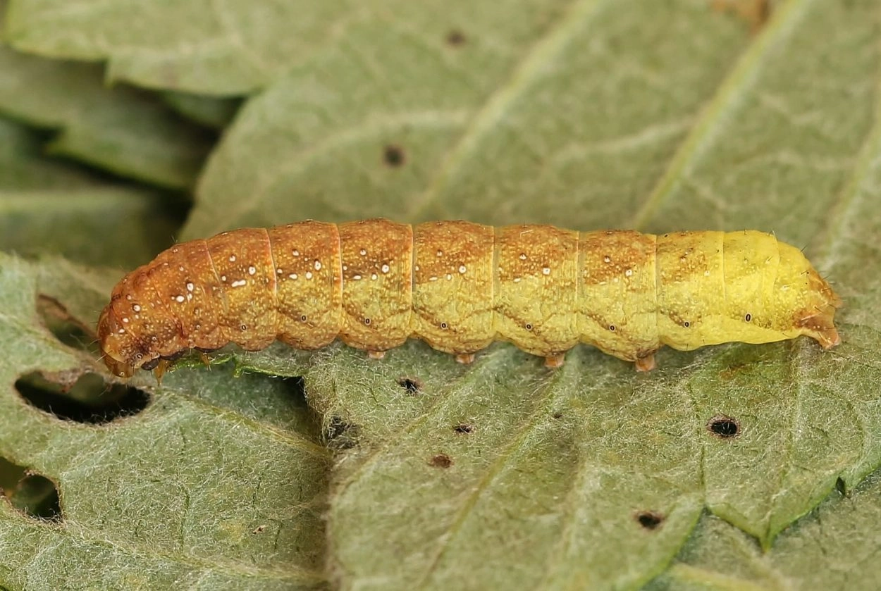 Tot 35 mm; lichaam bruinachtig geel of bleek groenachtig bruin, met purperachtig bruine zweem, vooral naar de kop en op de onderzijde; over de rug een rij purperachtig bruine, V-vormige vlekken en identiek gekleurde, schuine strepen over de spiracula; kop lichtbruin met donkerder tekening.
