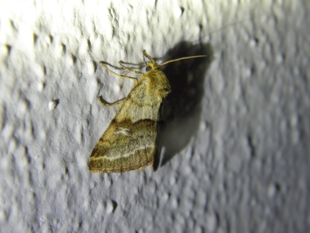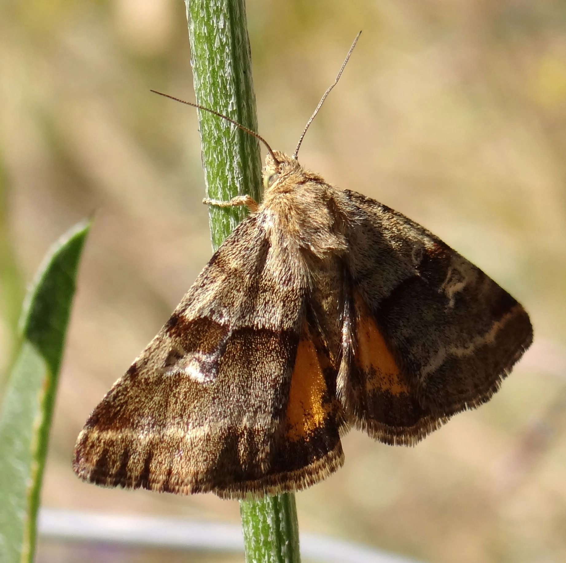 Voorvleugellengte: 16-18 mm. Vanwege de oranjegele achtervleugel met de smalle bruine zoom doet deze overdag vliegende uil enigszins denken aan de dwerghuismoeder (Panemeria tenebrata). De grondkleur van de voorvleugel is licht grijsachtig geel tot grijs en daarop valt het donkere bandenpatroon goed op. Kenmerkend is de smalle lichte lijn die vanuit het lichte veld aan de binnenzijde van de relatief smalle donkere middenband dwars door deze band loopt; soms komt deze lijn niet verder dan halverwege de middenband en soms ontbreekt de lijn geheel. In het zoomveld valt tussen de donkere banden de lichte golflijn op.