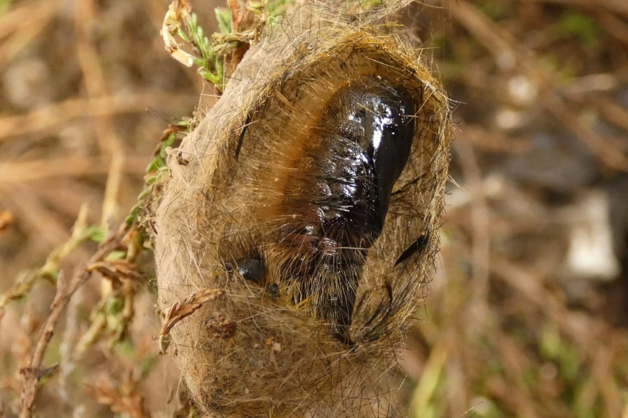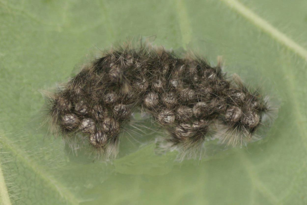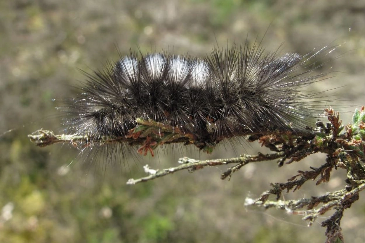Tot 40 mm; lichaam zwart, overdekt met lange grijze haarborstels en korte okerkleurige haren; segment vier tot zeven elk met een opvallende zwart en grijsachtig witte haarborstel op het midden van de rug; segment één met een paar naar voren wijzende borstels van lange zwarte haren en segment elf met een identieke maar naar achteren wijzende haarborstel op het midden van de rug; kop zwart.