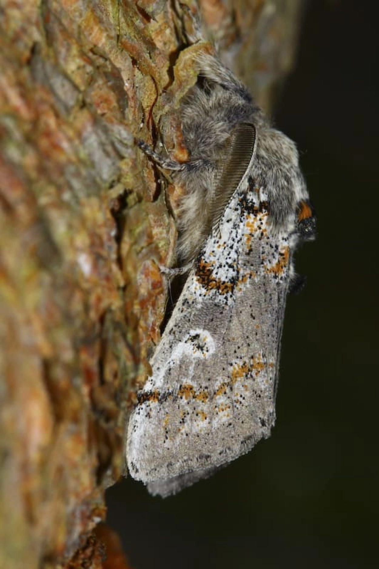 Voorvleugellengte: 18-28 mm. Deze nachtvlinder heeft een karakteristieke rusthouding waarin de ruig behaarde voorpoten ver naar voren gestrekt zijn. De grijze voorvleugel is zwart bespikkeld en heeft enkele onregelmatige zwarte dwarslijnen met meestal oranje vlekjes. Op het borststuk bevinden zich twee oranje vlekken en de antennen van het mannetje zijn grijs geveerd.