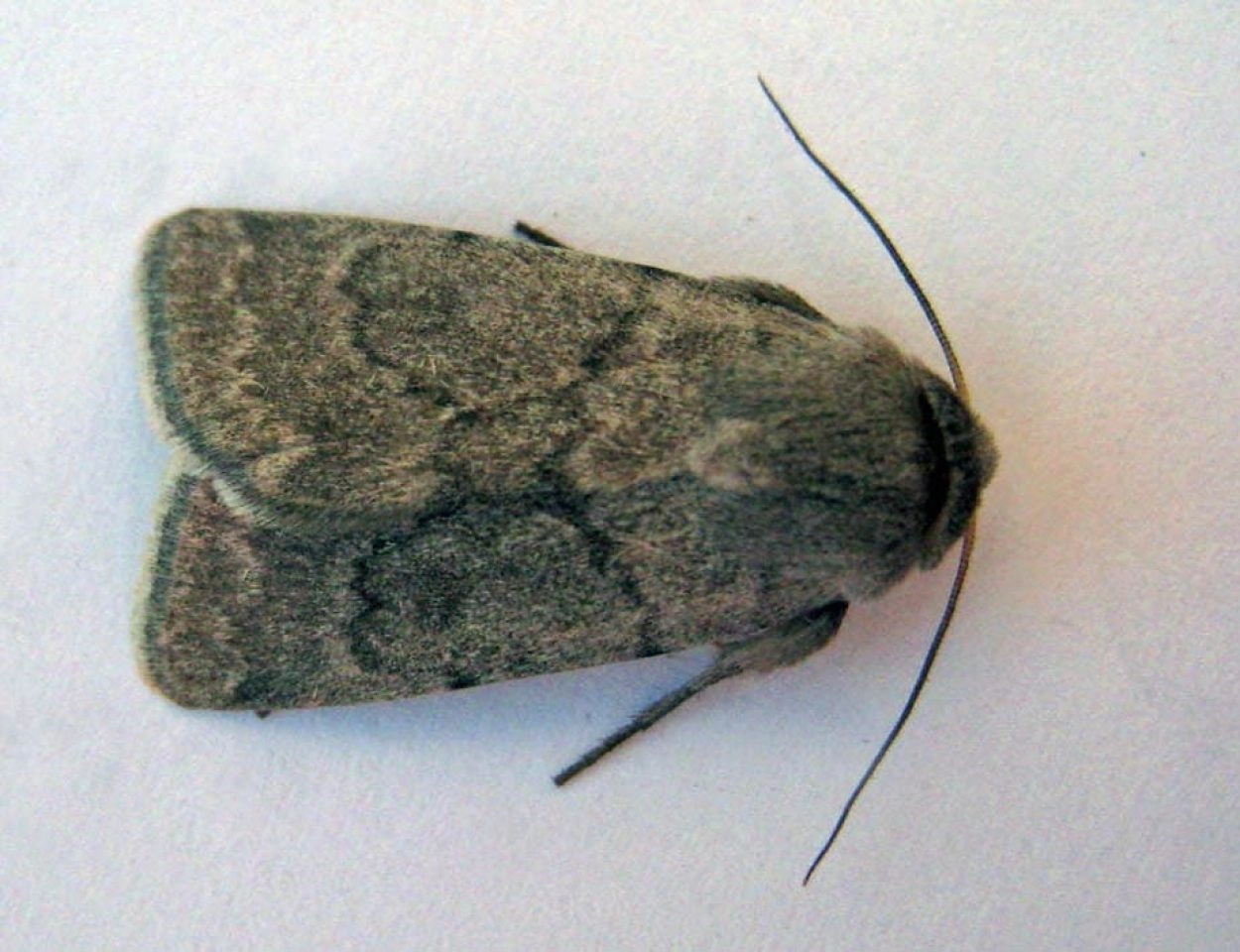 Voorvleugellengte: 16-17 mm. De voorvleugel van deze uil is grauwgrijs, soms met een blauwe of zilverkleurige waas, soms enigszins naar bruin neigend, en heeft een ruw aandoend uiterlijk. Er is relatief weinig tekening. Het duidelijkst zichtbaar zijn de donkere, doorgaans licht afgezette centrale dwarslijnen, die in de richting van de binnenrand naar elkaar toe lopen, en de golflijn waarvan vooral juist de lichte afzetting opvalt. De achterrand met franje vertoont vaak een lichte basis, een donker midden en een haast witachtig uiteinde. De niervlek is vaak vaag en de ringvlek is in de meeste gevallen onzichtbaar. De achtervleugel is licht met een parelmoerglans, heeft donkere aders en een smalle grijze zoom die sterk tegen de lichte basis van de franje afsteekt.