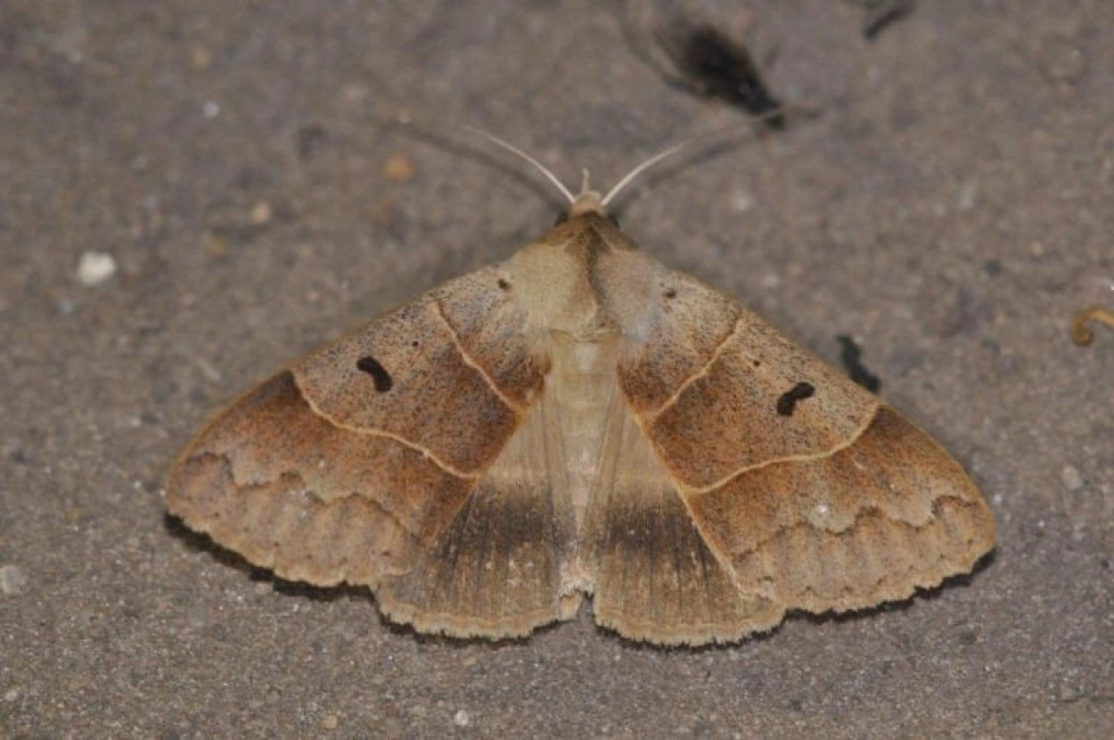 Voorvleugellengte: 23-26 mm. De voorvleugel van deze spinneruil is warmbruin of grijsachtig bruin met langs de buitenzijde van de buitenste dwarslijn een donkerbruine, soms bijna zwartachtige schaduwband. Opvallend zijn de licht golvende, crèmekleurige of geelachtige centrale dwarslijnen en de vrij kleine donkerbruine middenvlek; de ringvlek is gereduceerd tot een zwarte stip of ontbreekt. De achtervleugel is lichtbruin met een goudkleurige glans en heeft een iets donkerdere middenband.