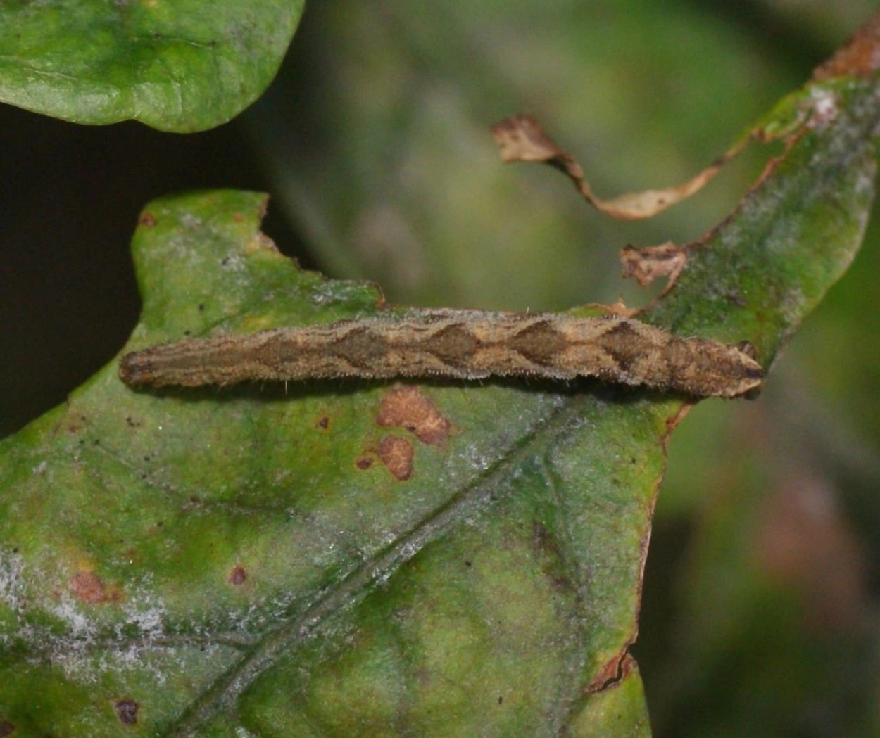 24-26 mm. Het lijf heeft bruintinten met een donkerder rij ruitjes op de rug; ook bedekt met bijzonder kleine grijsachtig witte wratjes. De rupsonderkant is donkerbruin en grijs.
