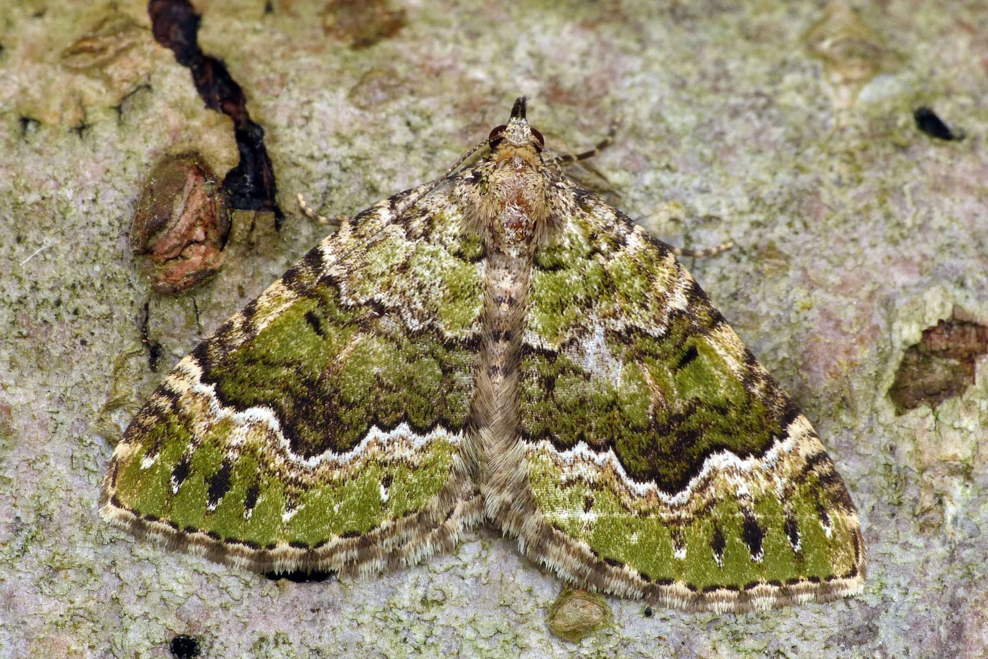Voorvleugellengte: 13-15 mm. De tamelijk afgeronde olijfgroene voorvleugel, de fijne gegolfde zwarte dwarslijnen en de opvallende regelmatige witte zones langs de donkere middenband, maken deze soort goed herkenbaar. In de loop van de vliegtijd verbleekt de groene kleur echter en ontstaat een wat grauwere geelachtige of bruinachtige kleur. De achtervleugel is bruinachtig lichtgrijs en heeft een geblokte franje. De tekening varieert slechts weinig.