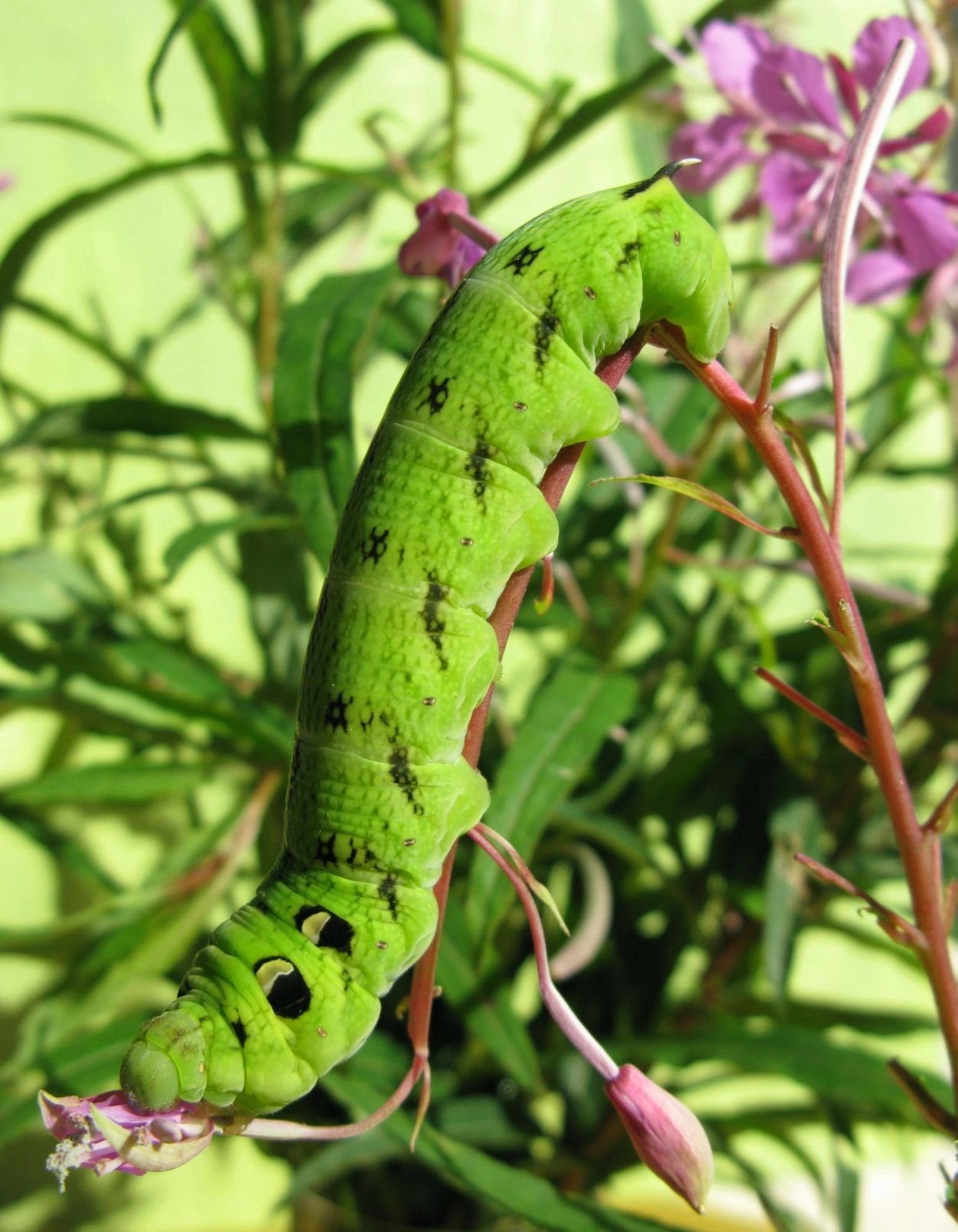 Tot 80 mm; dik en naar de kop sterk versmald; lichaam bleek okerkleurig en in sommige gevallen groen, sterk gespikkeld en getekend met bruinachtig zwarte schrapjes, maar in mindere mate op de eerste vijf segmenten. Op de rugzijde van segment vier en vijf zitten een paar opvallende, niervormige, witgeringde, bleekpaarse tot bruinpaarse 'oogvlekken' op een zwarte cirkel. De rups heeft een kleine hoorn op segment elf en de kop is donker grijsachtig bruin. De jonge rupsen zijn groen.