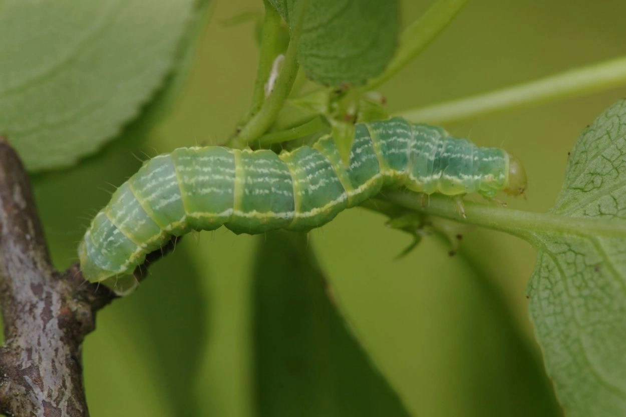 Tot 27 mm; lichaam glad en dik, naar de kop versmald, groen met bleek geelachtig groene banden tussen de segmenten; over de rug vier dunne, gebroken, gele lengtestrepen en een brede gele lengtestreep boven de spiracula; kop groen, zonder tekening. Er is ook een vorm met donkergroene lengtestrepen over de rug.
