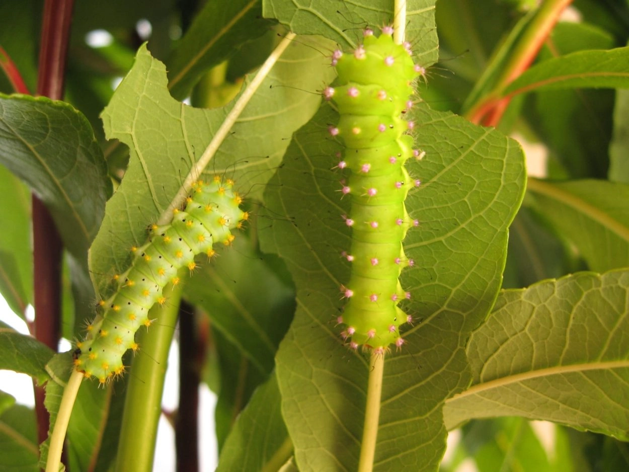 Tot 120 mm; lichaam helder geelachtig groen met bosjes zwarte borstelharen, die op de rug en flanken op wratten met hemelblauw geknopte uiteinden staan ingeplant; onder de spiracula loopt een witachtige lengtestreep; poten en anaalschild op segment dertien bruin; kop groen met een zwarte V-vormige tekening. De jonge rupsjes zijn zwart met rode wratten.
