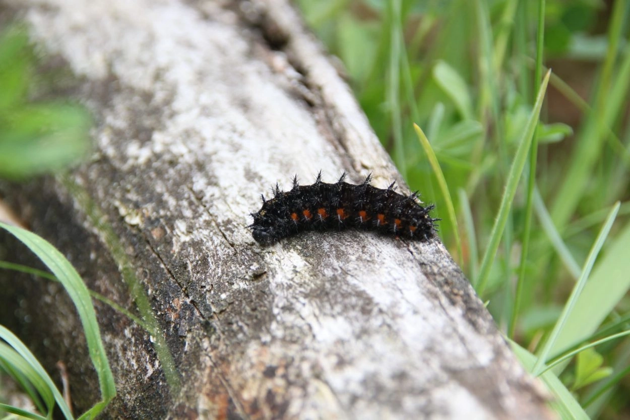 Tot 38 mm; lichaam fluweelzwart met zwarte doorns en onder de spiracula een rij oranjerode vlekken; kop glimmend zwart.