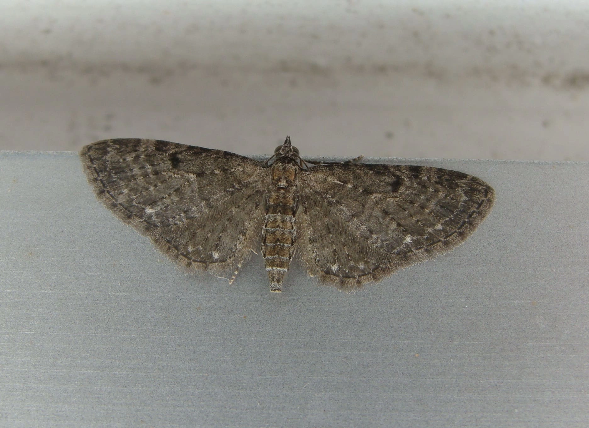 Voorvleugellengte: 10-11 mm. Deze tamelijk eentonig grijze dwergspanner wordt door veel nachtvlinderaars ervaren als een van de moeilijkst te determineren soorten; vaak is genitaliënonderzoek nodig om de soort met zekerheid vast te kunnen stellen. De vrij grote en langgerekte middenstip valt meestal goed op en ligt niet in het midden van de vleugel, maar dichter naar de vleugelwortel toe. Langs de voorrand liggen vaak donkere vlekjes en blokjes en aan de buitenzijde van de middenband ligt meestal een rij stippen. De golflijn is goed ontwikkeld en soms is zelfs een duidelijk vlekje in de binnenrandhoek te zien. Over de voorvleugel lopen lichte dwarslijnen en enkele aders zijn zichtbaar als zwarte streepjeslijnen. Op het borststuk is meestal een driehoekige witte stip aanwezig De mannetjes hebben in vergelijking met gelijkende soorten opvallend geveerde antennen.