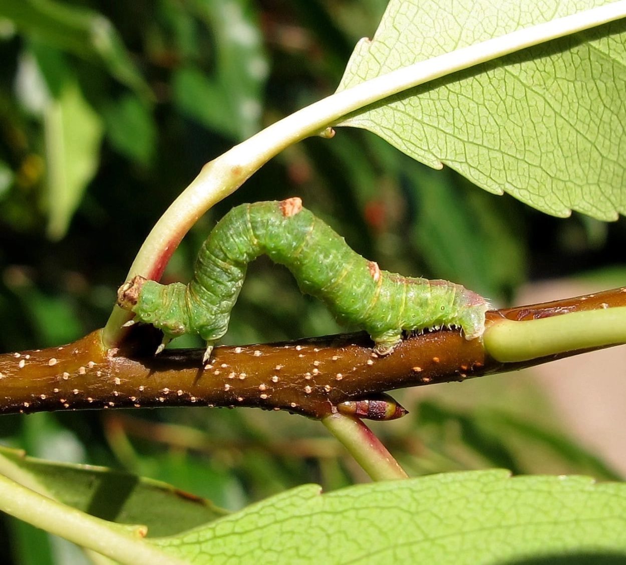 Tot 33 mm; lichaam grijsachtig bruin tot roodachtig bruin, soms groenachtig, met verschillende schakeringen van groen en bruin; het zesde segment met een opvallende, dubbelgepunte bult; kop bruin. In tegenstelling tot de andere spannerrupsen heeft deze soort twee extra buikpoten.