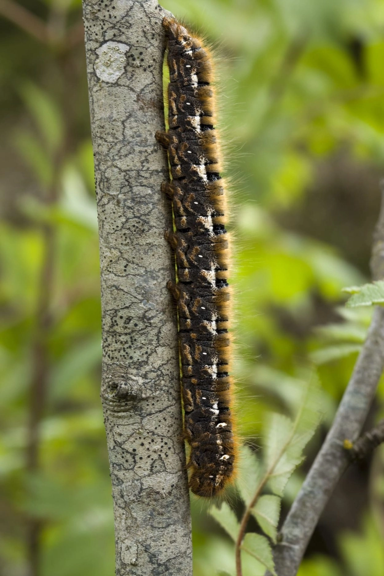 Tot 65 mm; lichaam donkerbruin tot zwart, overdekt met bruinachtige haarborstels; boven de spiracula een rij witte strepen en onder de spiracula soms een rij roodachtige strepen; kop donkerbruin.