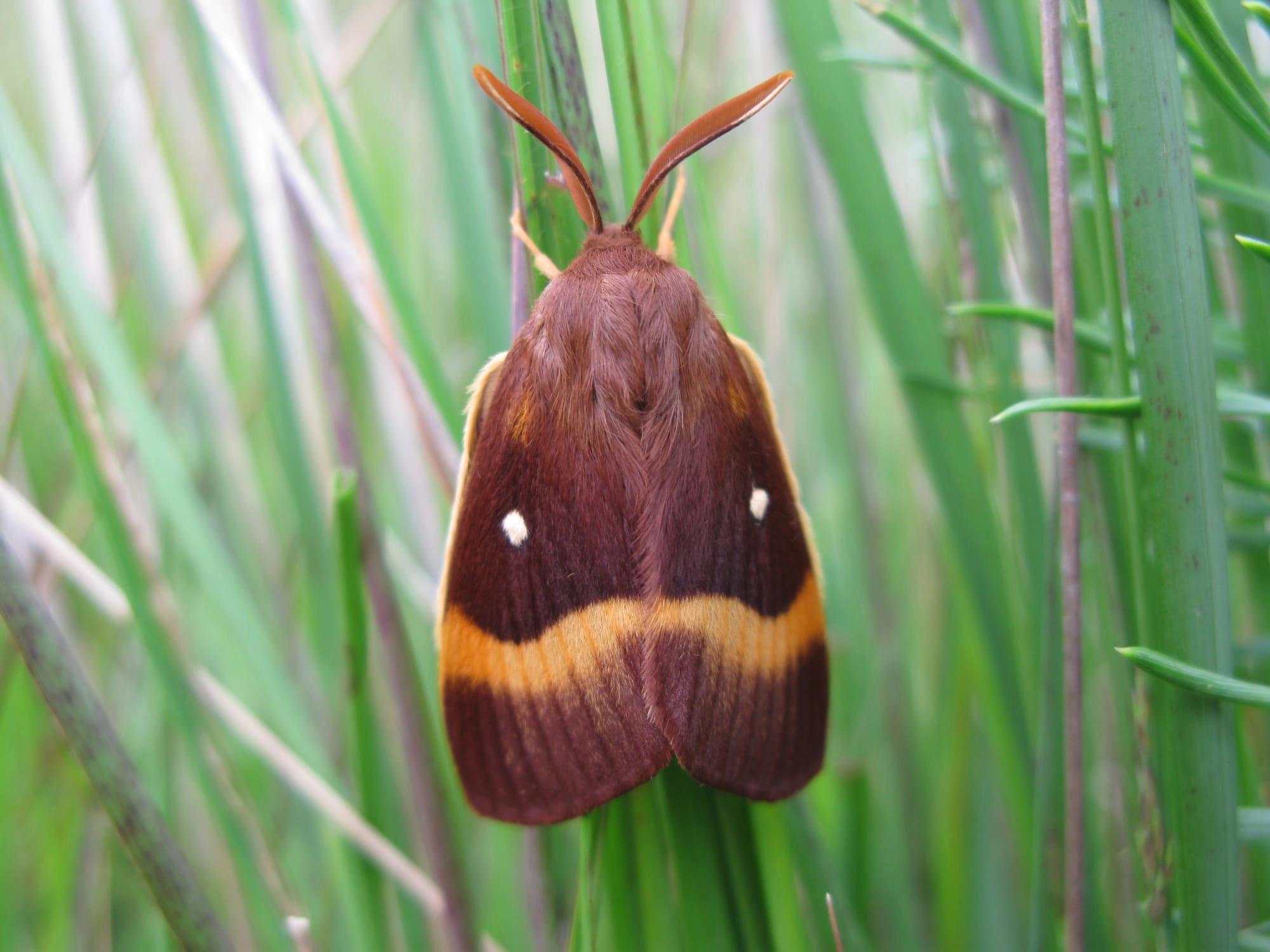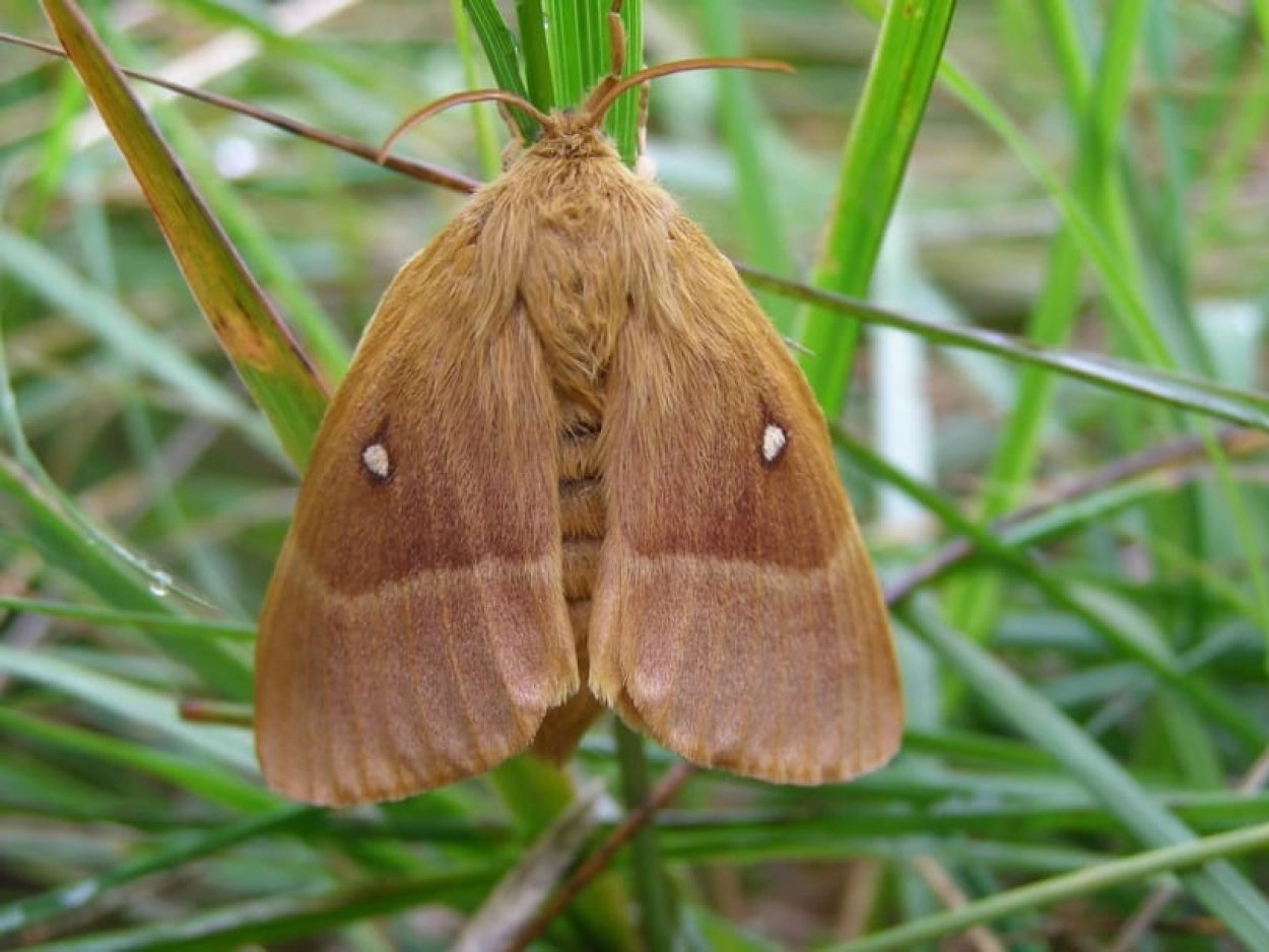 Kleine hagenheld (Lasiocampa trifolii).N.B.: vergelijk behalve de uiterlijke kenmerken ook de tijd van het jaar waarin de rupsen voorkomen, het habitat en de waardplant(en).