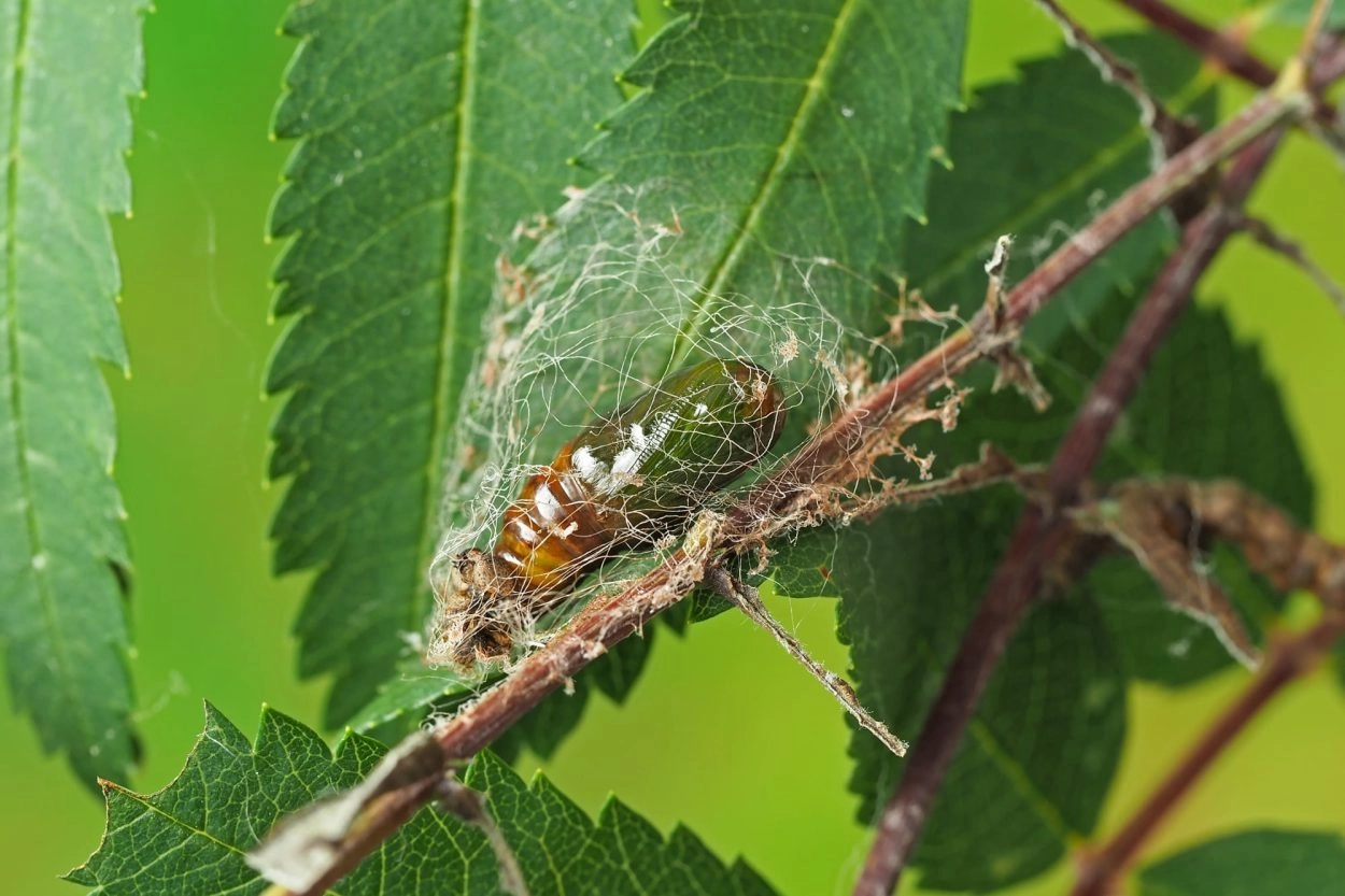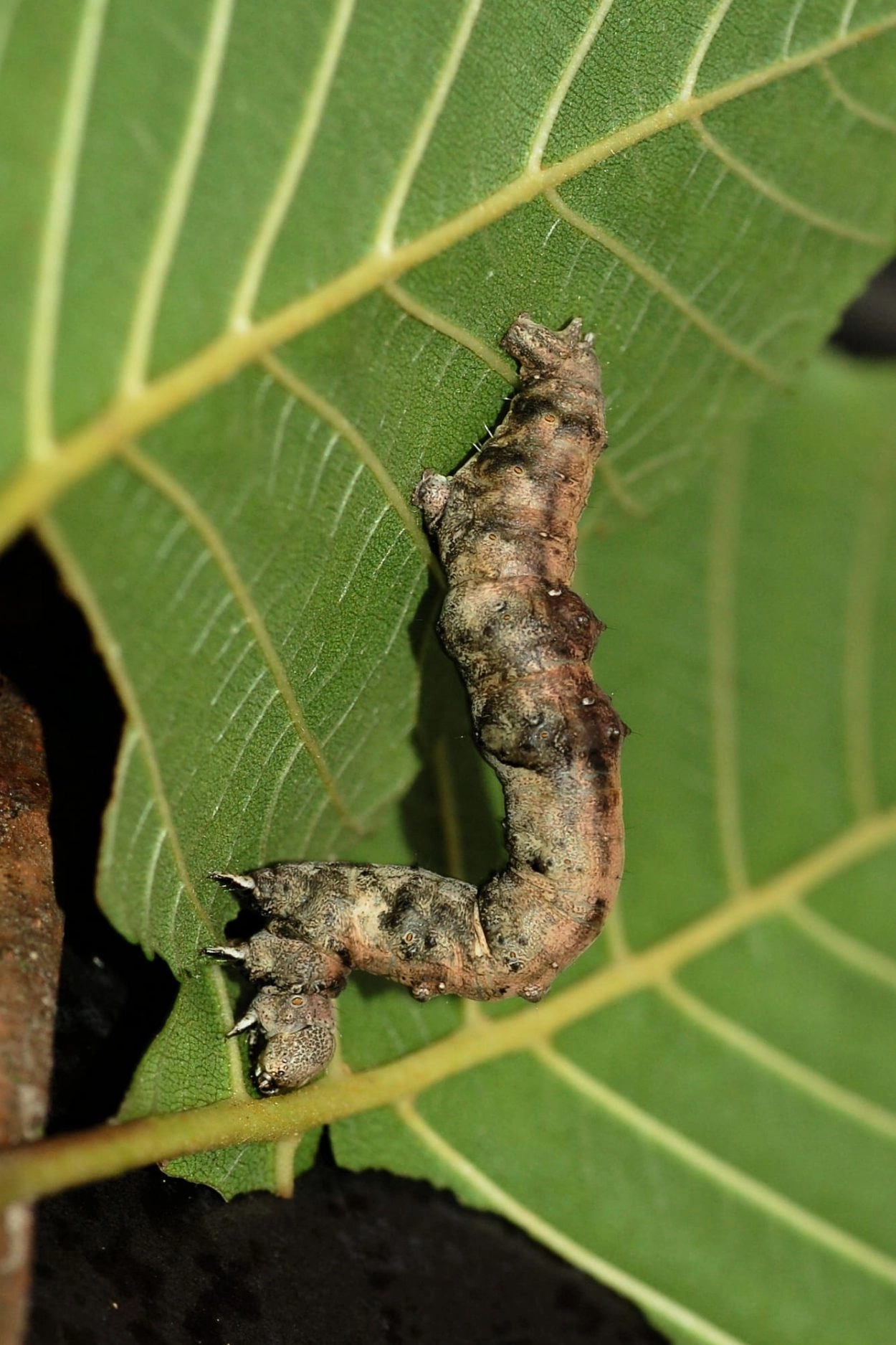 Tot 38 mm; lichaam varieert in kleur van donker grijsachtig bruin tot licht roodachtig bruin; het derde paar poten van de thorax gezwollen als knoppen van een twijg; de segmenten vier, vijf, zeven en acht eveneens gezwollen; kop bruin of zwartachtig bruin