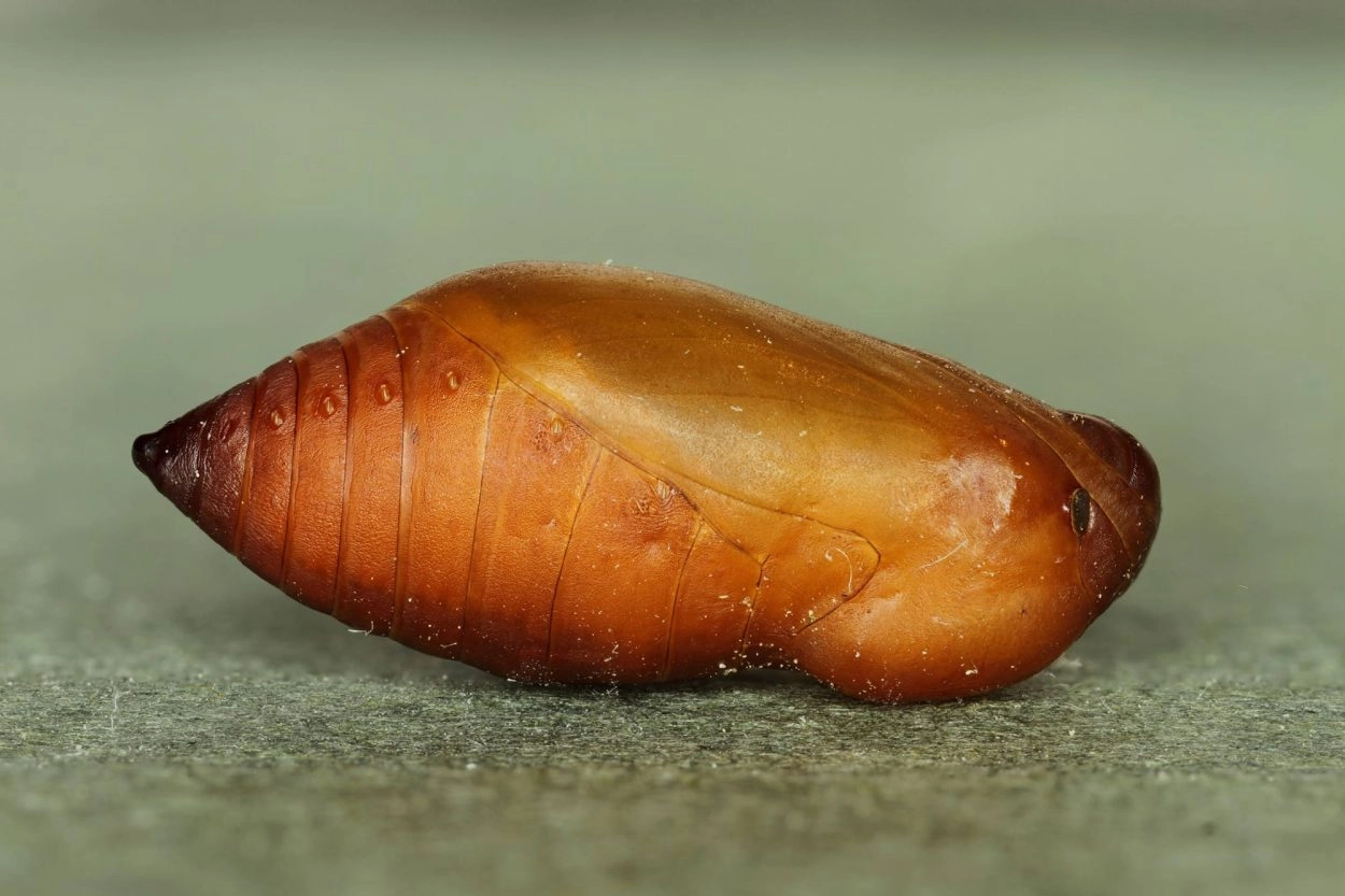 Tot 23 mm; naar de staart versmald, lichaam geelachtig wit met een bruine middenstreep over de rug en donkerbruine strepen boven de spiracula; een okerachtige streep loopt over de spiracula; staartjes met okerkleurige uiteinden; kop bruinachtig wit.
