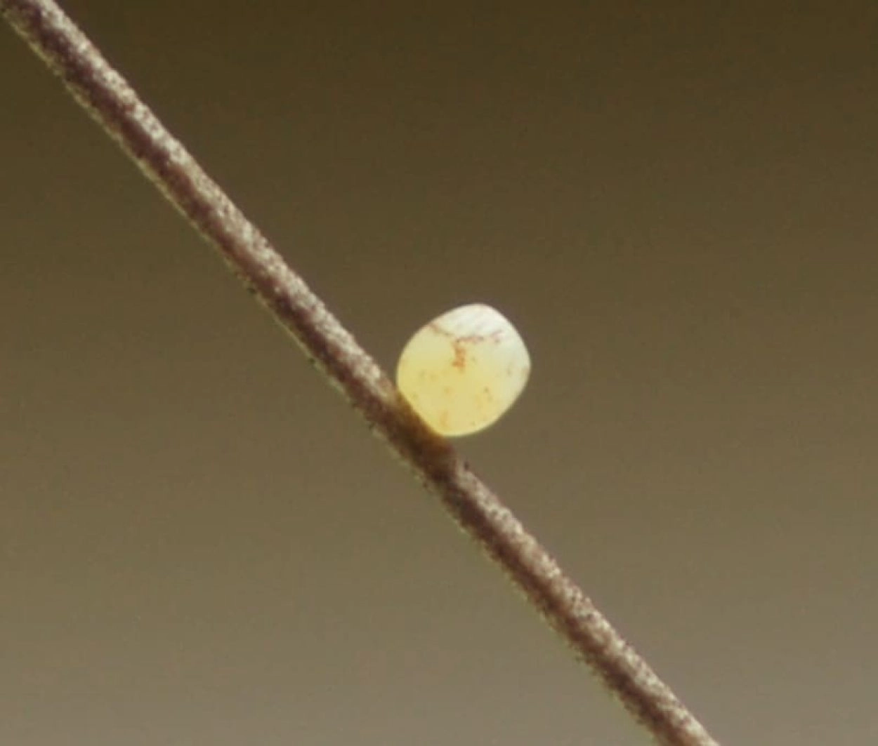 De eitjes worden afgezet op de overgang van een hoge naar een lage grazige vegetatie. Het vrouwtje zet de eitjes afzonderlijk af, meestal laag in de vegetatie vlakbij de bodem. Daarbij zit het vrouwtje op een stengel of een blad en legt het eitje op het dichtstbijzijnde sprietje, wat overigens niet altijd een geschikte waardplant is. Daarna loopt het vrouwtje over dezelfde stengel verder naar een ander blad en zet wederom een eitje af.