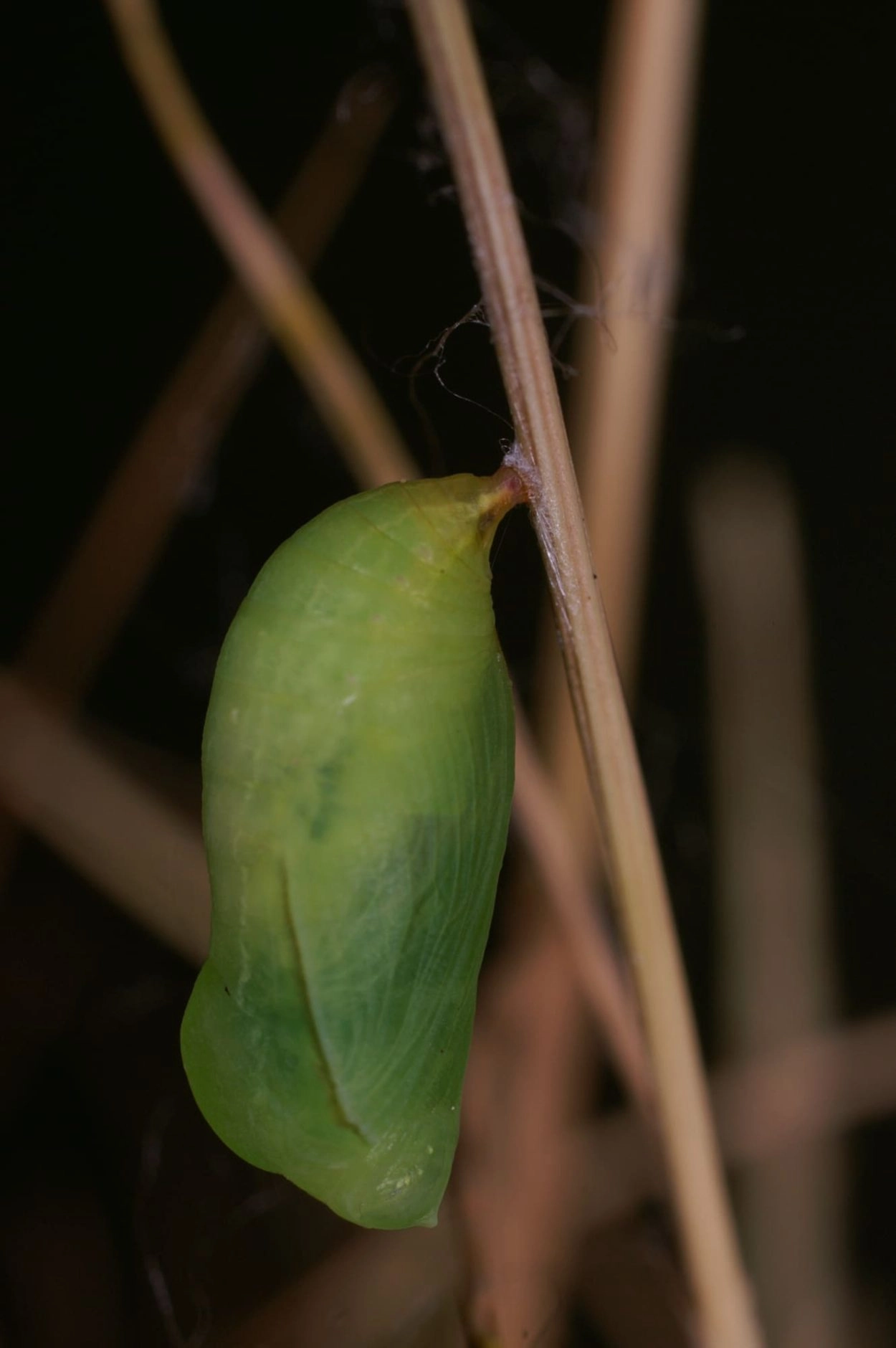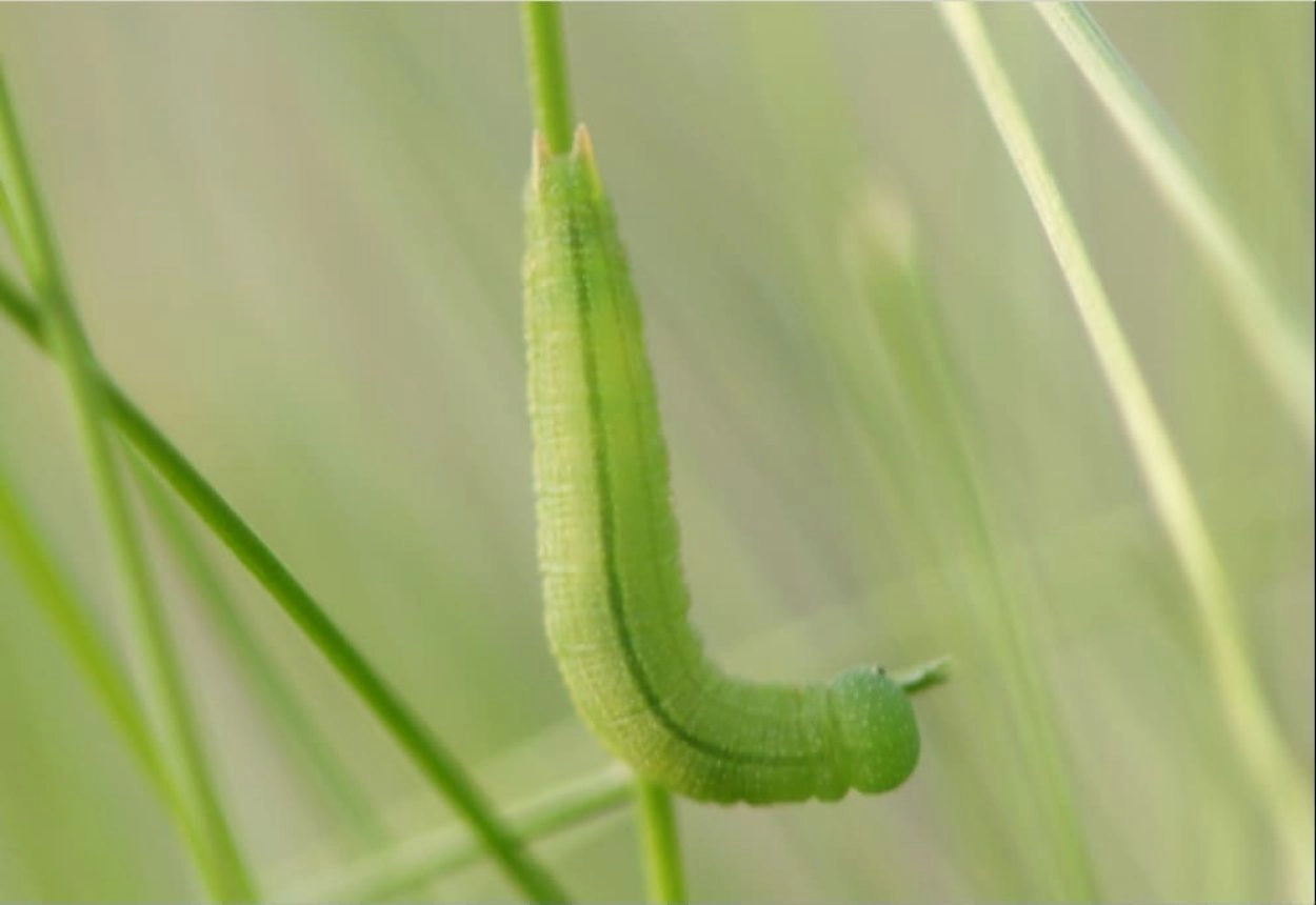 Tot 18 mm; lichaam groen, fijn wit gespikkeld, met een donkergroene middenstreep over de rug met aan weerszijden een donkergezoomde, witachtige lengtestreep; onder de spiracula een groenachtig witte lengtestreep; staartjes roze-achtig met witachtige uiteinden; ronde groene kop.
