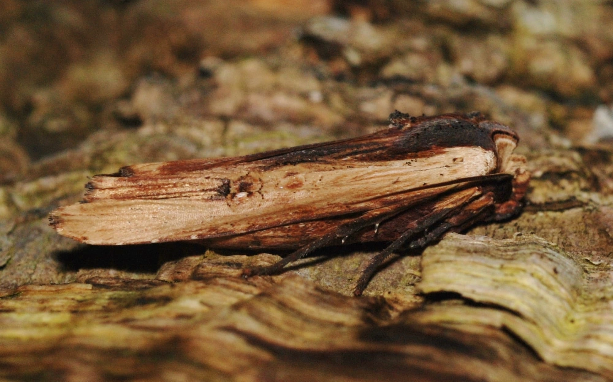 Voorvleugellengte: 24-29 mm. Deze uil rust met de vleugels dicht rond het lichaam gevouwen en lijkt daardoor op een afgebroken takje; dit wordt versterkt door het streperige houtkleurige uiterlijk en de stompe bruingele kop. Kenmerkend is het kleurcontrast tussen de beide helften van de voorvleugel, wat vooral bij opengevouwen vleugels goed zichtbaar is. Het gedeelte langs de voorrand is strokleurig met een oranjerode tint en de helft langs de binnenrand is diep mahoniebruin of zelfs zwartbruin. Bij sommige exemplaren is de lichte strook breder en raakt deze ter hoogte van de niervlek de binnenrand van de vleugel. Op de grens van de lichte en donkere helft ligt een gereduceerde lichte ringvlek en een gedeeltelijk zwartachtige niervlek. Aan de binnenzijde van de golflijn ligt een langgerekte zwarte pijlvlek die reikt tot aan de donkere vlek achter de niervlek (de pijlvlek is over het algemeen duidelijker aanwezig dan op de tekening te zien is); soms is daarnaast een kortere tweede pijlvlek zichtbaar. Het onderste deel van de achterpoten is donker roodbruin. Ook het contrast tussen de lichte kop en het donkere borststuk valt op.