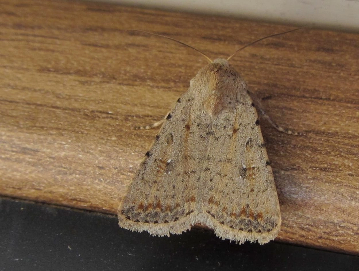 Voorvleugellengte: 12-15 mm. De vrij smalle voorvleugel van deze uil heeft een lichte tot donkere bruinachtig grijze kleur en een ruw aandoend uiterlijk. Langs de voorrand zijn drie of vier zwarte vlekjes zichtbaar. De ringvlek is meestal klein en valt soms nauwelijks op. Van de smalle, vrij kromme niervlek is vooral de binnenste lob opvallend zwartachtig gekleurd; de rest van de niervlek is meer geelbruin van kleur. Kenmerkend zijn de witte puntjes langs de randen van de niervlek, die soms echter nauwelijks zichtbaar zijn. De vleugelzoom is opvallend donker gekleurd door de grijze zoom langs de buitenzijde van de lichte golflijn en de brede bruine, soms sterk getande afzetting aan de binnenzijde van de golflijn. De achtervleugel is wit of grijsachtig wit met een zwakke parelglans en een bruinachtig grijze franjelijn, waarvan de kleur zich ook langs de aders uitstrekt.