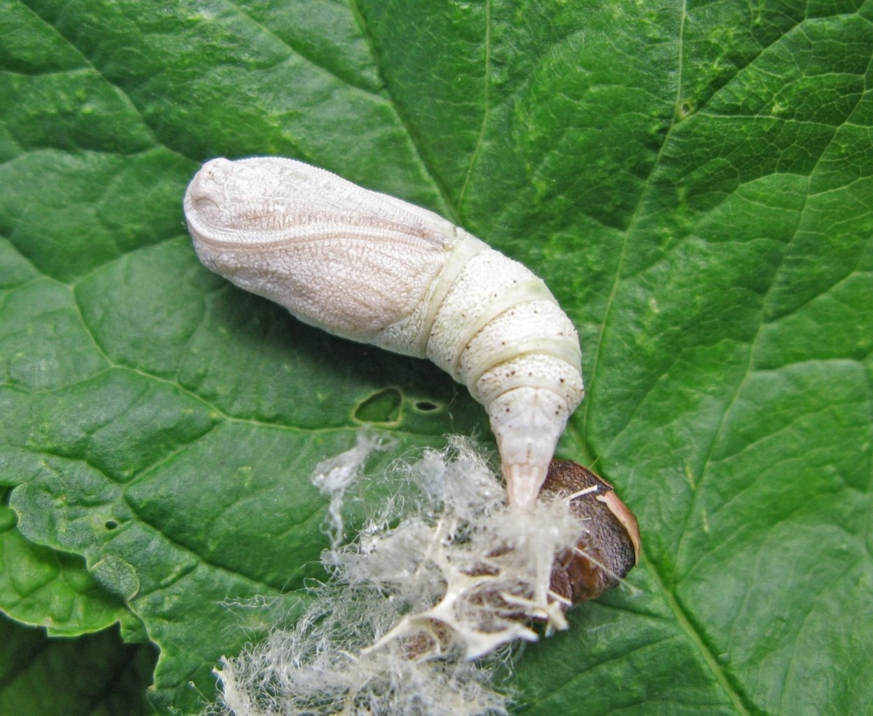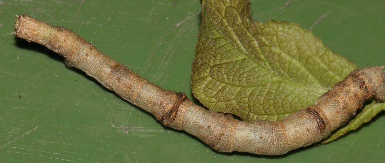 Tot 55 mm; zeer slank, naar de kop versmald; bruin of groenachtig bruin met okerkleurig bruine tekening, glanzend; de segmenten vijf, zes en acht gezwollen, waardoor hij sterk op een takje lijkt; kop tamelijk rechthoekig in omtrek, grijsachtig bruin met okerkleurige tekening.