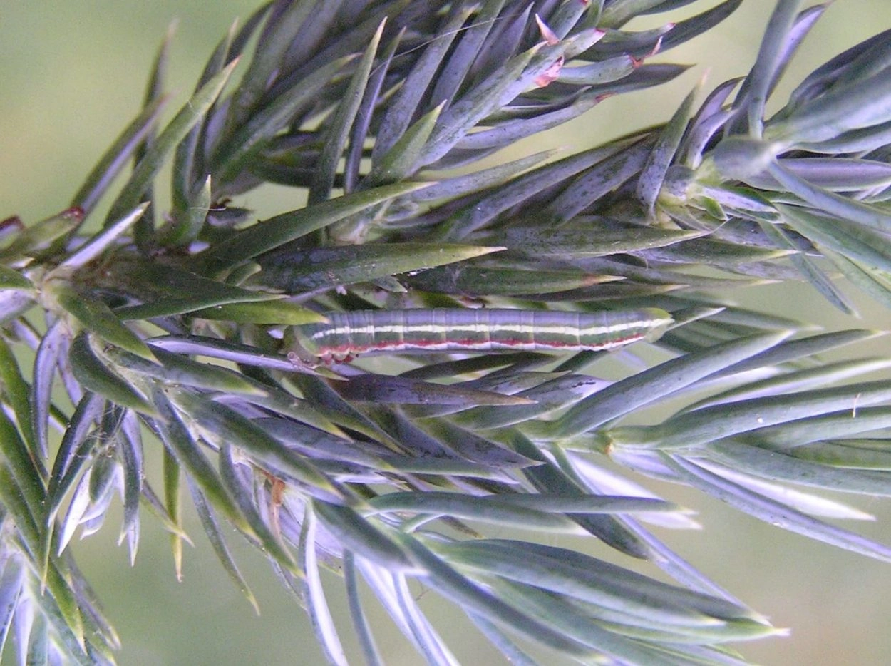 Hoekbanddennenspanner (Pennithera firmata), sparspanner (Thera variata), schijn-sparspanner (Thera britannica), naaldboomspanner (Thera obeliscata), streepjesdwergspanner (Eupithecia intricata), lariksdwergspanner (Eupithecia lariciata), dennenspanner (Bupalus piniaria), dennenbandspanner (Pungeleria capreolaria), lariksspanner (Macaria signaria) en gerimpelde spanner (Macaria liturata). N.B.: vergelijk behalve de uiterlijke kenmerken ook de tijd van het jaar waarin de rupsen voorkomen, het habitat en de waardplant(en).