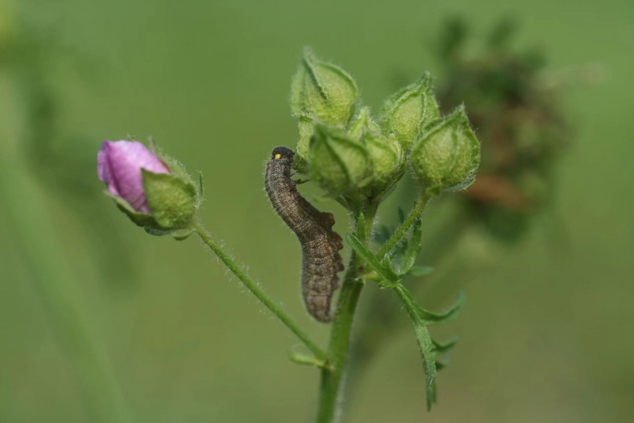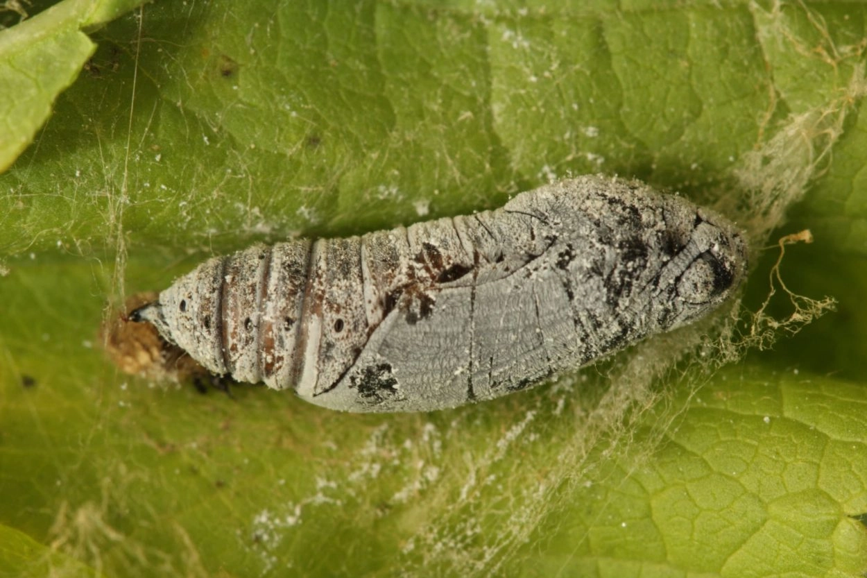 Tot 23 mm; tamelijk forse rups, naar de uiteinden smal toelopend, grijsachtig groen met blauwe zweem; kraag achter de kop opvallend zwart met gele vlekken; spiracula geel met zwarte randen; kop groot en zwart.