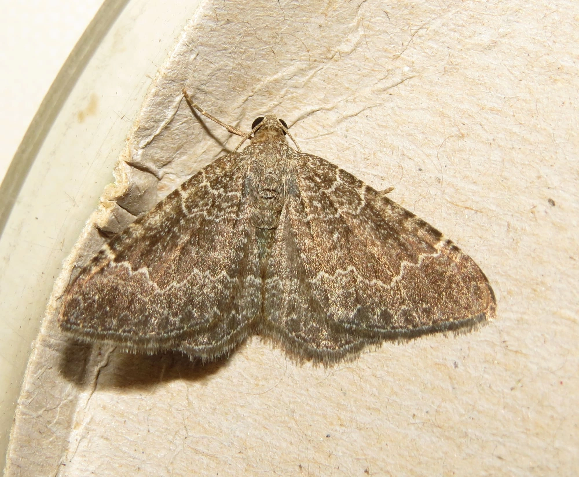 Voorvleugellengte: 12-14 mm. Een donkerbruin spannertje dat door de grove donkere spikkeling een tamelijk ruw uiterlijk heeft. Op de voorvleugel bevinden zich enkele zeer fijne, grillige witte dwarslijntjes. De achtervleugel is iets lichter van kleur.