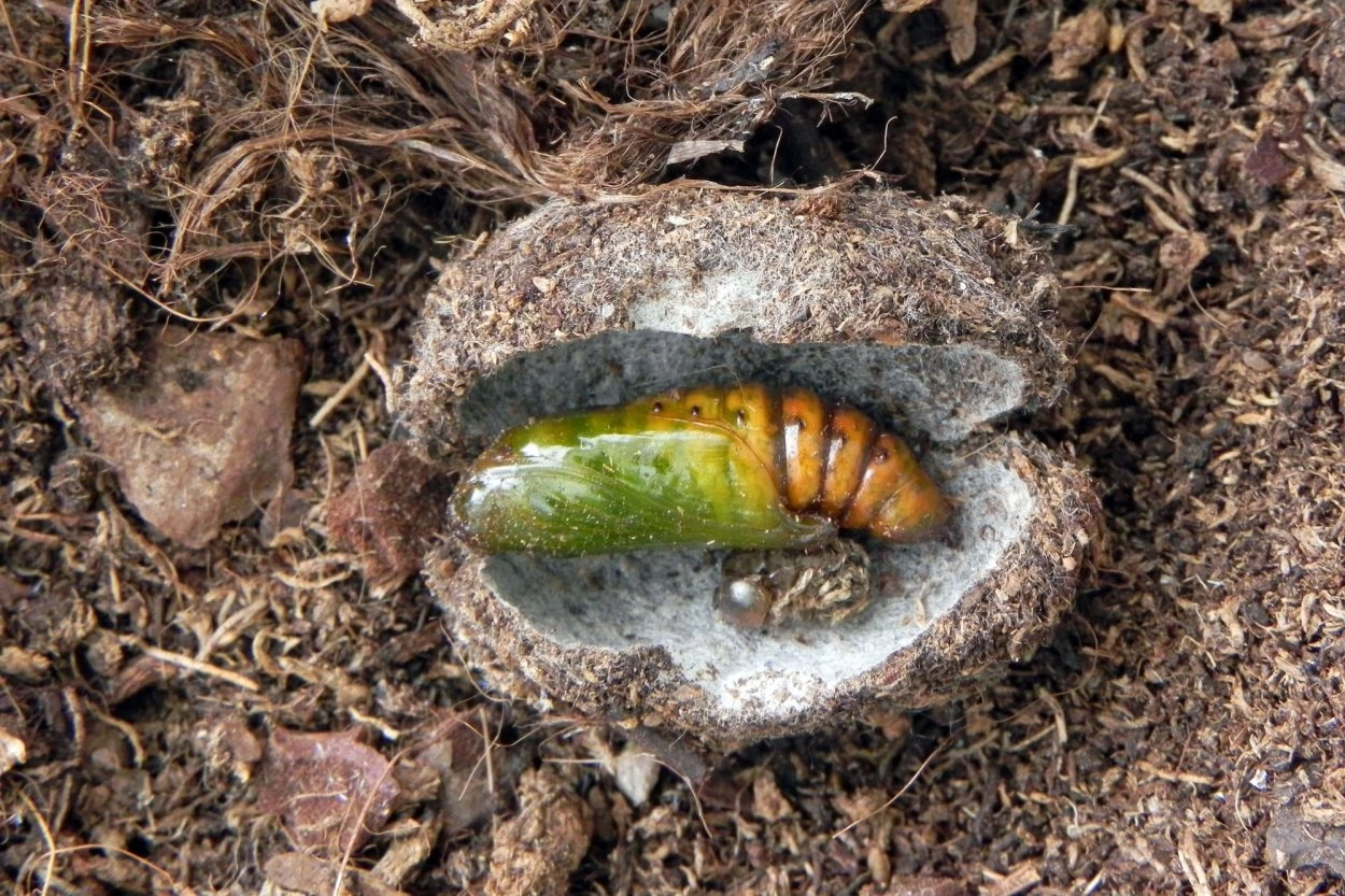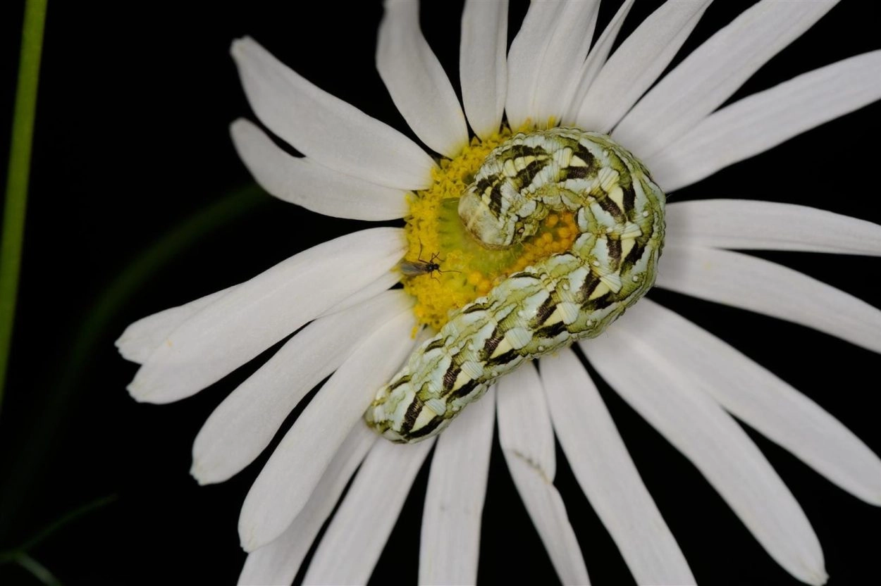 Tot 45 mm; lichaam geelachtig groen tot groenachtig wit, onderzijde donkerder groen; over de rug twee rijen diagonale, groene, in V-vorm gerangschikte strepen met daartussen een rij purperachtig roze vlekken; over de spiracula een gebroken groene lengtestreep met daaronder een rij purperachtig-roze vlekjes; kop groenachtig wit met donkerder tekening.